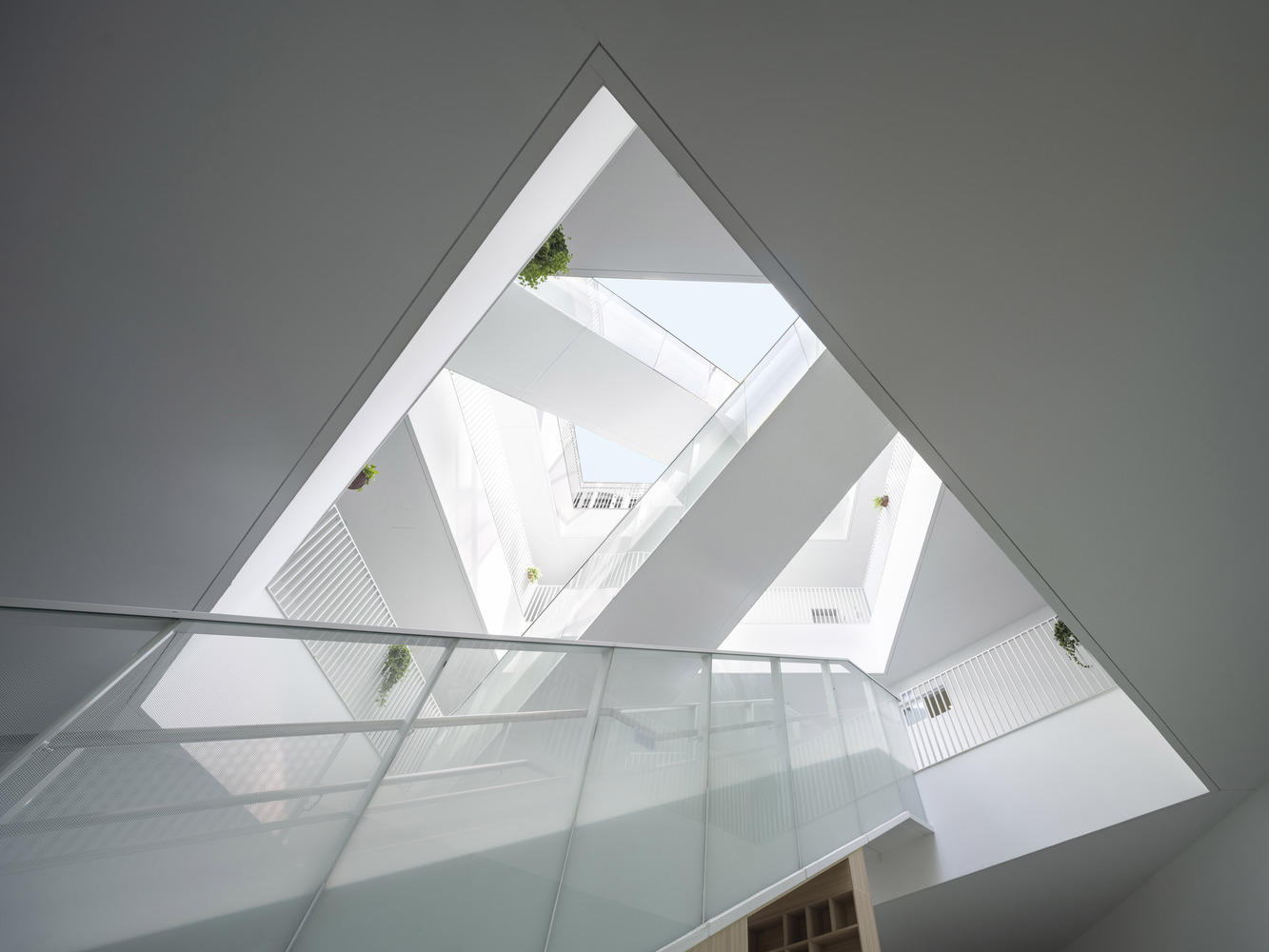 空间构思的独特性与创新:九曜幼儿园的设计最令人印象深刻的是其对“小世界,小宇宙”的独特诠释。在极其有限的用地条件下,设计师并没有采取常规的堆叠模式,而是巧妙地运用了“十字”这一古老而普世的符号作为空间的基本骨架。通过对十字形结构的旋转和叠加,打破了单调重复的空间模式,营造出丰富多样的空间层次。这种旋转不仅在外观上产生了虚实相间的视觉效果,更在内部营造了不同楼层之间既相似又不同的体验,激发了孩子们对空间方位的探索。这种设计理念是对传统幼儿园设计的一次大胆突破,展现了设计师对儿童空间体验的深刻理解。