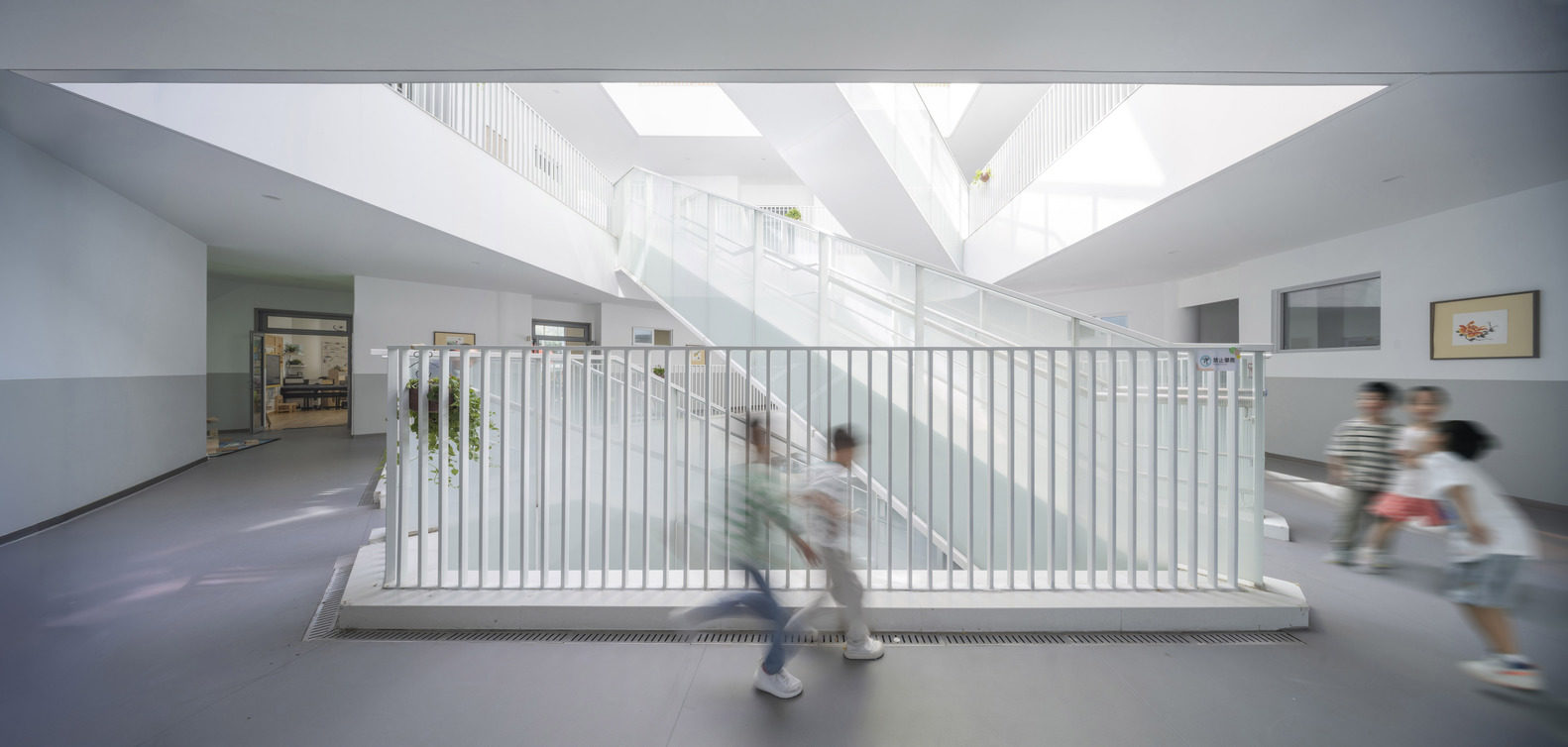 The cities where children live in their daily lives, especially in residential areas, are basically layers of replicated spatial relationships; Even though some kindergartens have exaggerated shapes and bright colors from the outside, the spatial structure of each floor is still monotonous and repetitive. The original intention of our design is to break this monotony through a rotating motion, using seemingly simple body language and pure white colors to create a simple yet rich world for children, subtly changing their fixed cognition of the laws of things, and allowing them to gain a more open perspective from spatial experience.