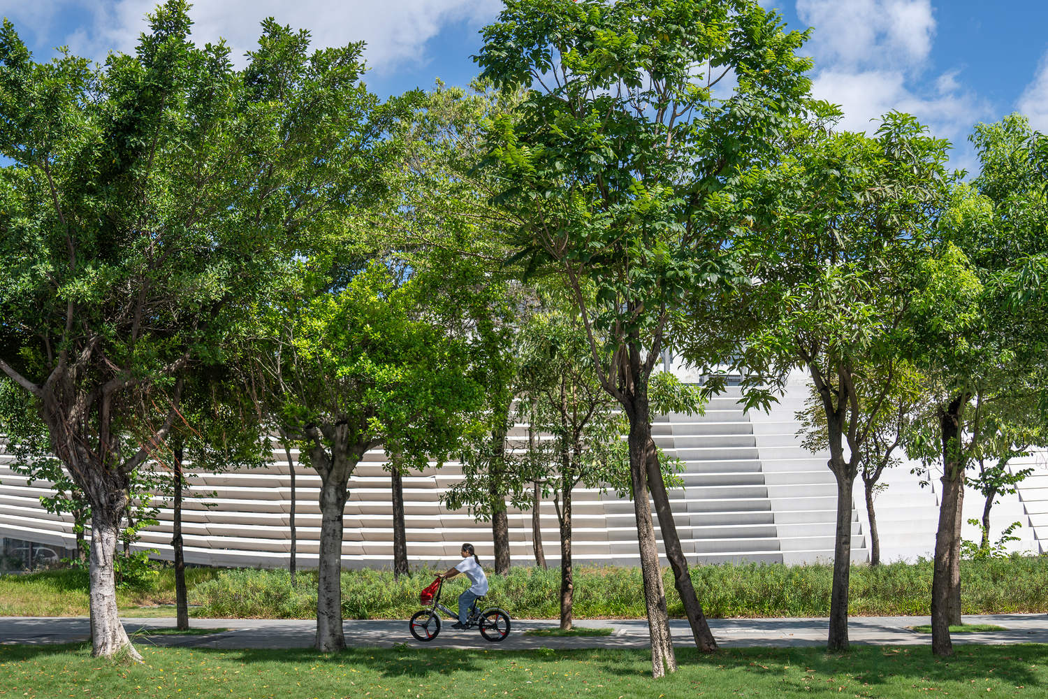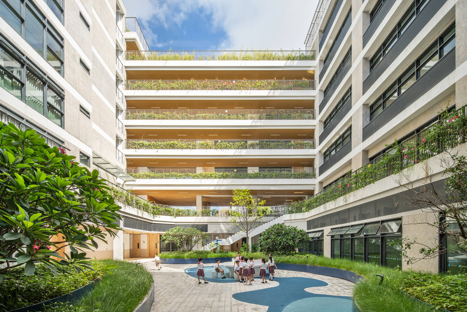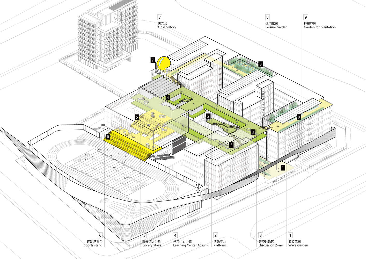 交通组织采用环形立体回廊,开放楼梯串联各层,形成连续公共路径:从入口“海浪花园”,经平台、中庭、图书馆台阶,到运动场看台与屋顶花园,流线即场景,通行即游逛。