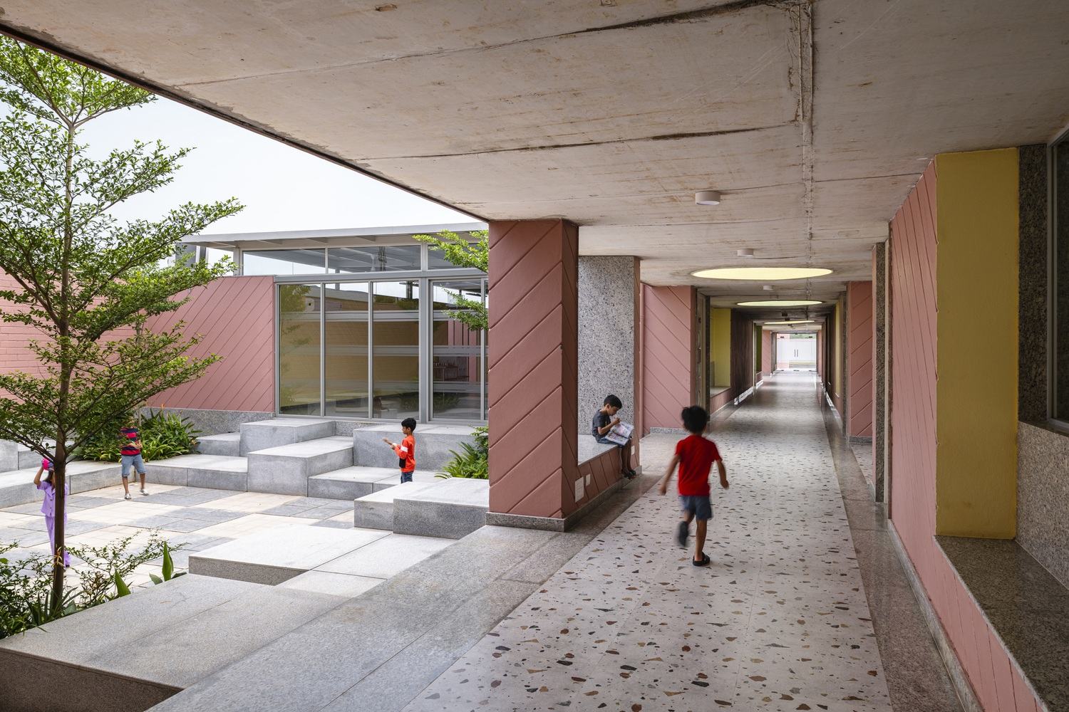 The school is located on a narrow 1.9-acre site running north-south, with a main road to the south and a small alley to the west. The northern half of the venue is a playground, while the school occupies the southern half. The architectural layout is based on a central linear axis - the only concrete structure in the building - with each room symmetrically distributed on both sides. This main axis is equipped with a circular skylight, dividing the school into east and west wings, and regularly opening to the courtyard.
