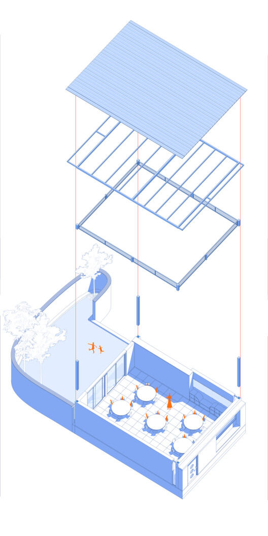The room is constructed with a metal frame and sandwich panel roof. The roof is slightly raised to allow hot air to be expelled through ventilation openings, keeping the room cool. The buffer spaces such as kitchen, storage room, and bathroom are cleverly arranged on the west side to alleviate the scorching afternoon sun.
