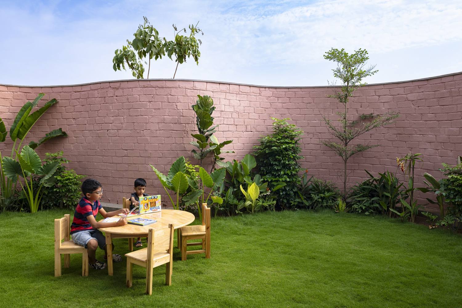 Our core design principle is to ensure that each classroom leads to a green courtyard, which is a direct extension of the classroom. These courtyards are surrounded by curved earthen walls, providing children with a protected natural learning and play space. Here, children can sit outdoors, grow vegetables, and interact with their peers. These earthen walls are made by reusing discarded bricks from other projects of the construction company, and are coated with earth colored paint on the surface.