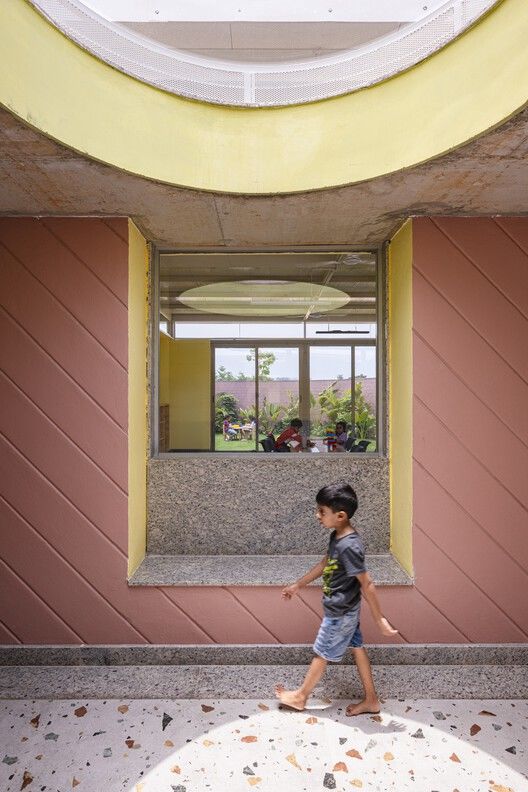 空间体验:Avinia校园的空间设计旨在激发孩子们的好奇心和创造力。教室与绿色庭院的直接连通,创造了一种开放、自由的学习氛围。孩子们可以自由地在室内外空间穿梭,进行各种活动。 中央轴线的特殊设计,通过设置座位和休息区,鼓励学生之间的互动交流,打破了传统校园的刻板印象。整个建筑空间充满了趣味性,无论是圆形天窗带来的光影变化,还是土墙围合的庭院,都为孩子们提供了丰富的感官体验。项目在有限的场地内,最大限度地利用空间,为孩子们创造了一个既安全又充满探索乐趣的学习环境,堪称典范之作。