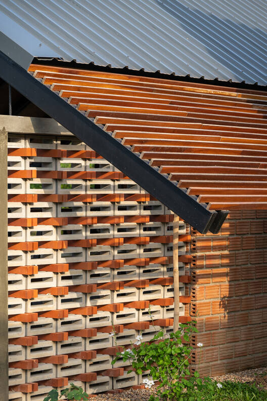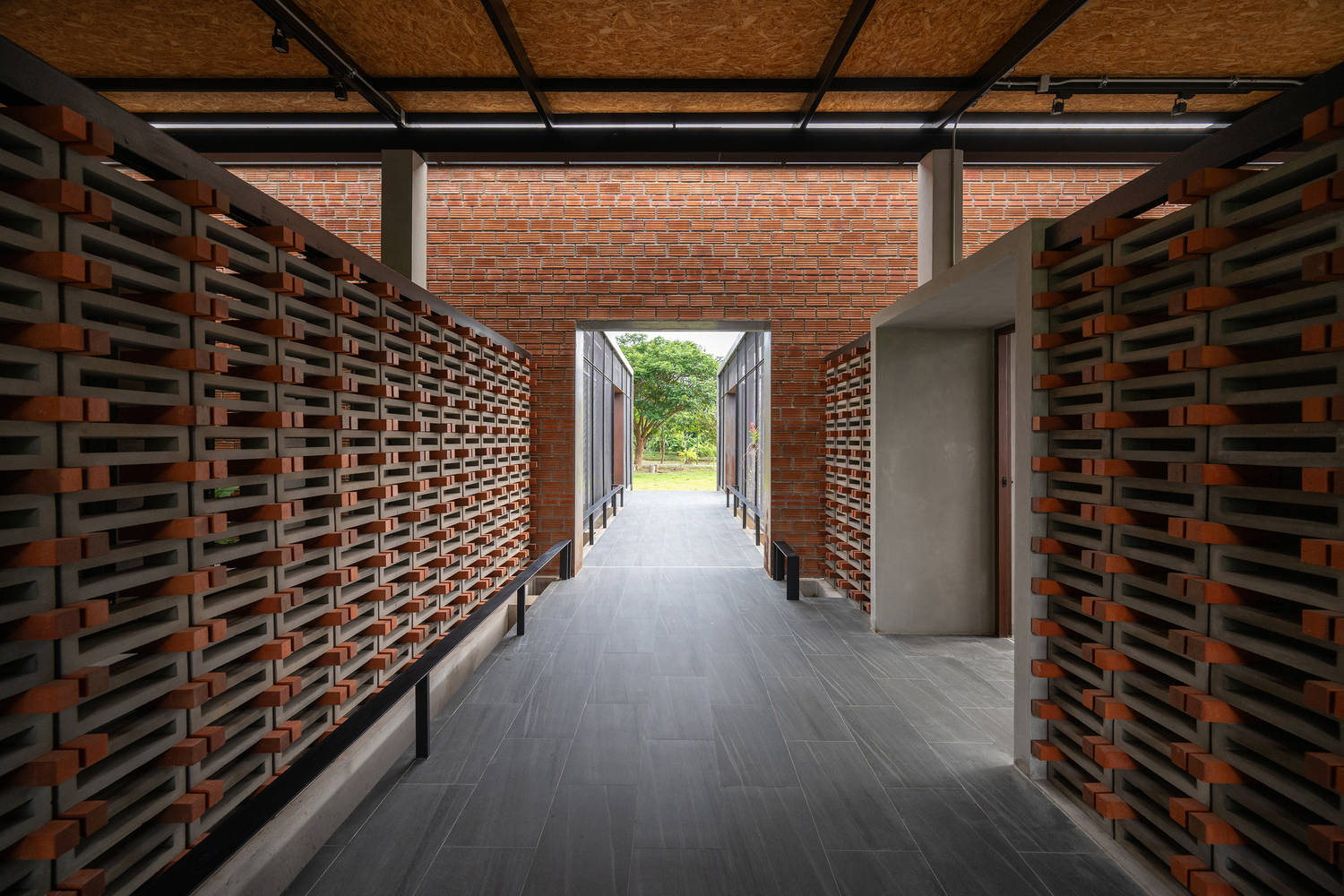 材料:采用当地常见且易于获取的材料,如砖块(彰显稳固性)、穿孔砌块(实现通风效果)以及回收木材(体现生态价值)。这些材料共同构成了一个与周边景观完美融合的整体色调与质感。