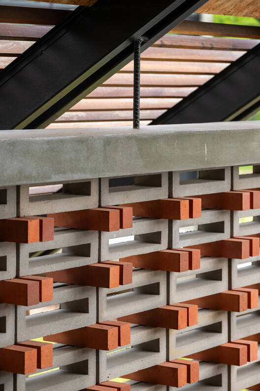 Materials: Using locally common and easily accessible materials such as bricks (to demonstrate stability), perforated blocks (to achieve ventilation), and recycled wood (to demonstrate ecological value). These materials together form an overall color tone and texture that seamlessly blends with the surrounding landscape.