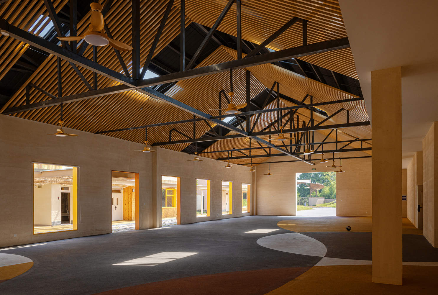 新的校园被构想为一个“学习的村落”。教育不再局限于封闭教室,而是通过多个功能单元围绕庭院展开,由竹编廊道串联。学习发生在室内,也发生在田野、树下和溪边。这样的空间策略打破了学校与自然之间的边界,鼓励孩子们保持好奇、合作和自主探索。