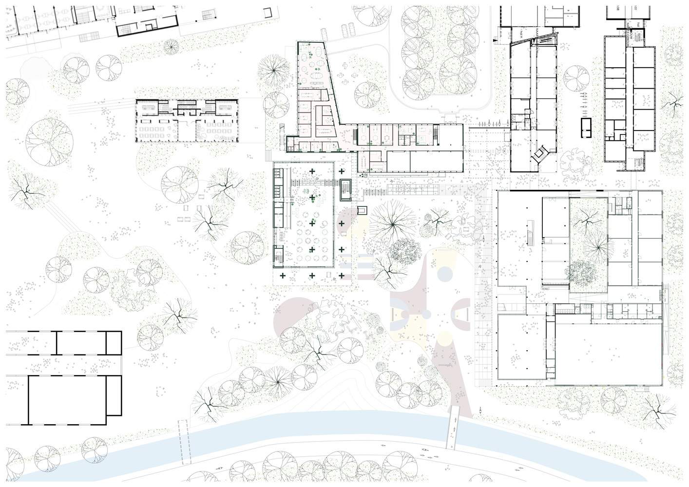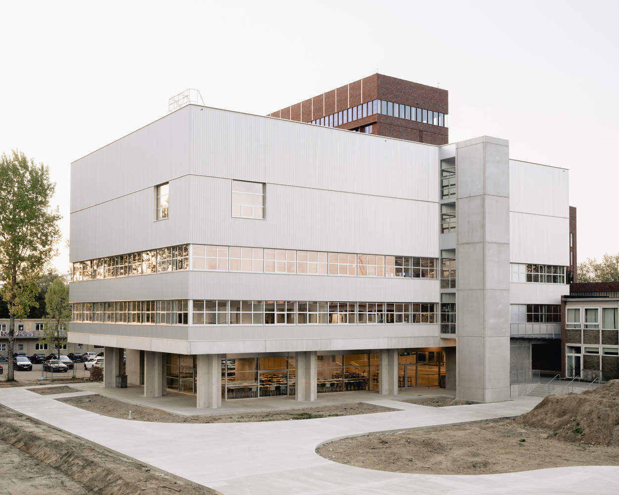 毗邻的德梅尔河(Demer River)与Kapermolen公园成为场地的自然锚点。新校舍采取紧凑清晰的五层体量,战略性地布置在场地边缘,距离河流约40米,从而为一片开阔的绿色操场留出了空间。