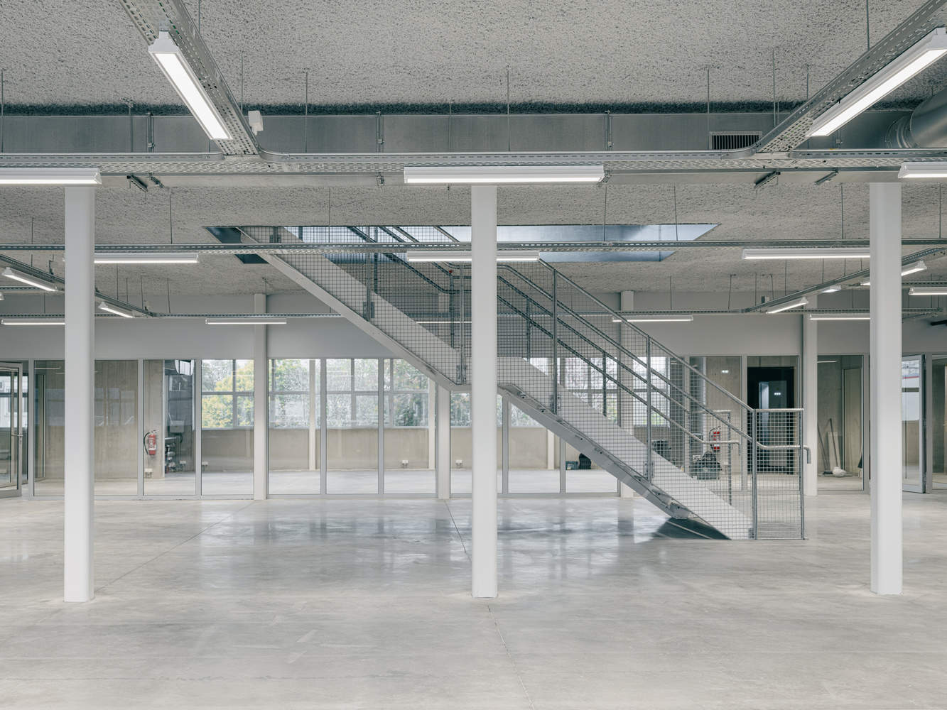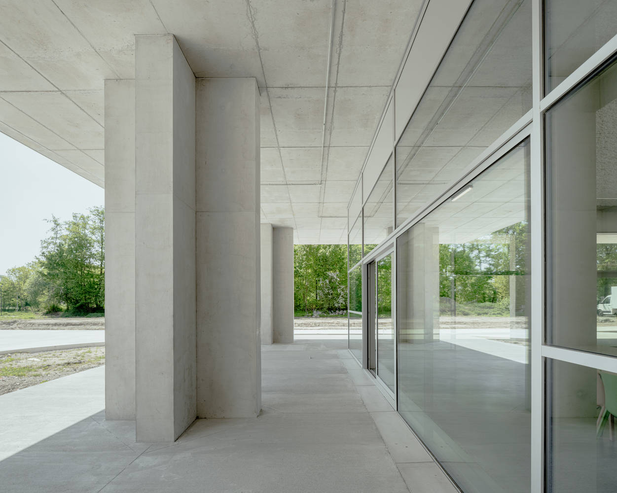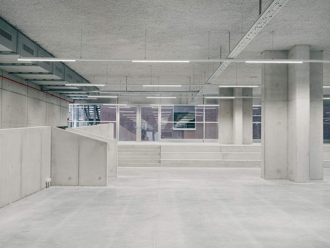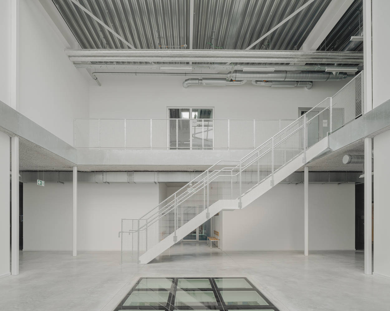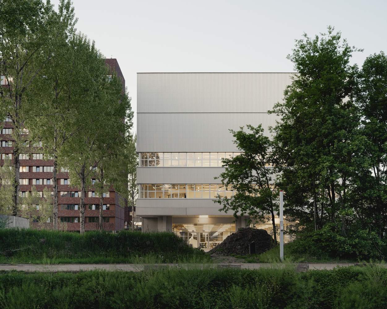 建筑的上层空间容纳了体育、舞蹈与戏剧等场所,围绕中央的“广场”布局。设计灵感源于典型的工业化艺术家工作室:简洁、坚固且高度适应性。通透的首层向公园与操场敞开,独特的混凝土十字柱为建筑赋予了鲜明的识别度。铝板外立面在绿意的映衬下泛起微光,而基于 1x1米模数的水平窗带则提供了全景视野,进一步强化了建筑与环境的联系。