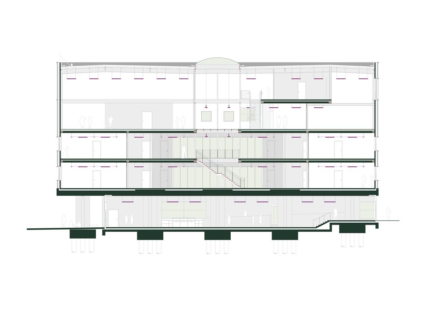 在纵向立面上,透明的技术工坊与开放的艺术工作室被布置在沿街一侧,强化了可视性与交流感。建筑的核心是一个“论坛” —— 多功能的公共空间,可作为会面点、展览区、开放工作室或讨论场所。开放式平面(plan libre)营造出动态的学习景观,让功能在其中自由流动,带来流畅的学生体验。