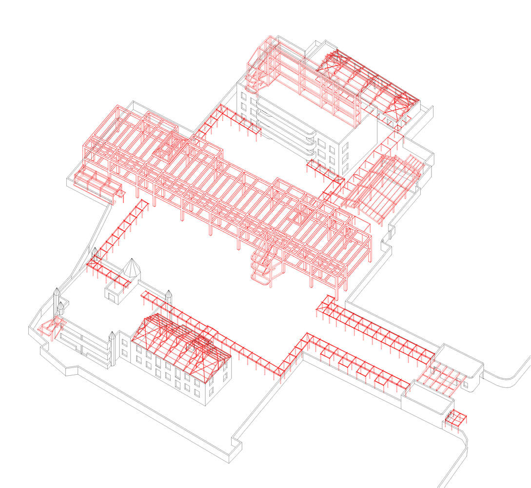 1、3 号楼及门卫楼为上世纪 90 年代建造的幼教建筑,为半砖混、半框架结构。本次改造对它们进行结构加固,并同时改善保温、隔热、通风和采光等建筑性能。1、3 号楼各增设一部钢结构疏散楼梯。原“科学室”、4 号楼为砖承重墙、木屋架混合结构房屋。本次改造在加固砖砌体结构的同时,将木屋架替换为钢屋架。“科学室”屋面增设天窗,使之适用于阅览、美术等教学内容。“科学室”东、南侧在原有檐口以下增加披檐,与风雨连廊和 1 号楼疏散通道衔接。