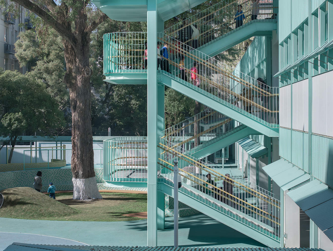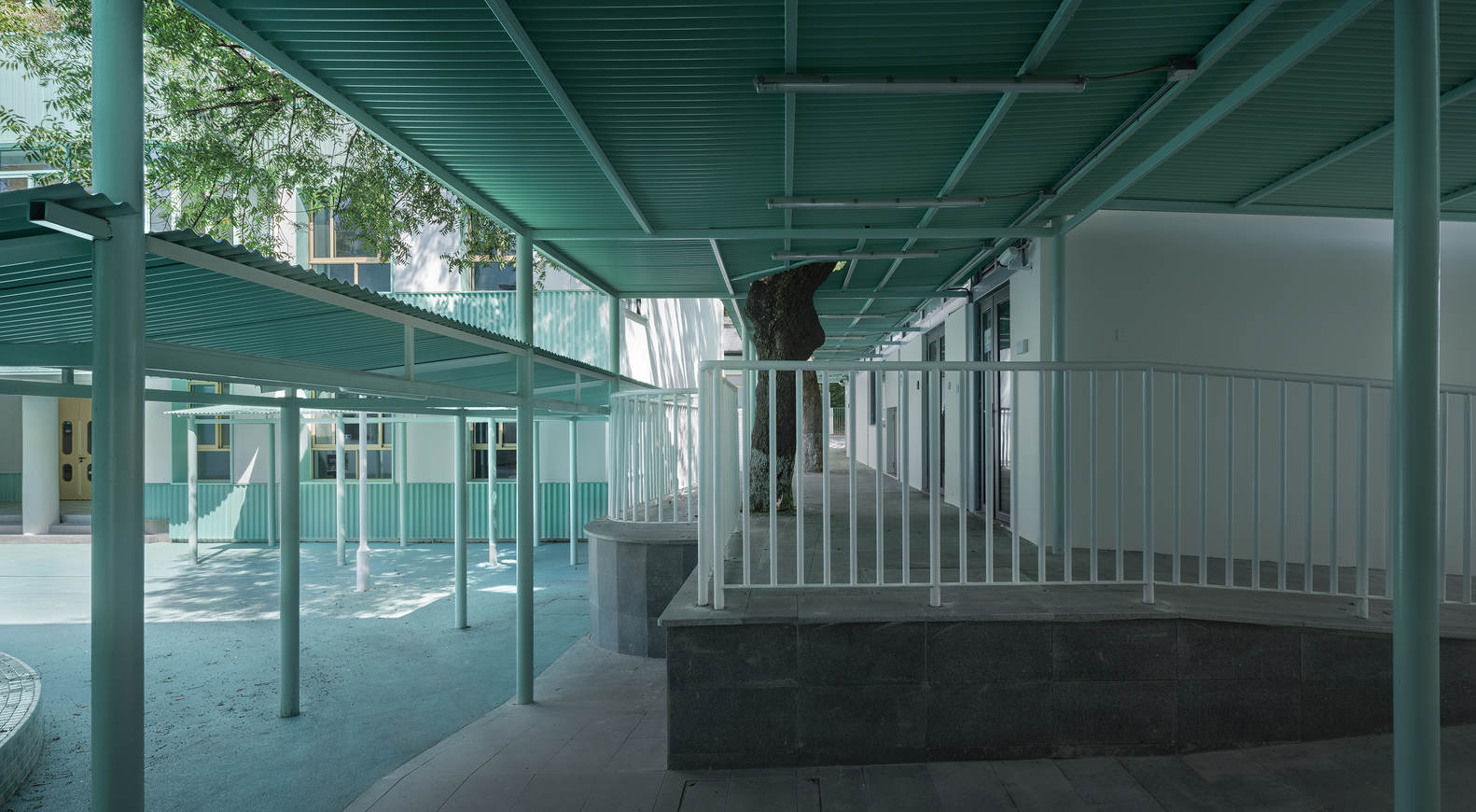 The original "Construction Activity Room" and "Equipment Room" were simple shanties that could no longer be used. In this renovation, they will be dismantled and rebuilt. Among them, the original "construction activity room" has been replaced with a steel structure kitchen; Replace the original "equipment room" with a steel structure teacher's lounge. 1. The facades of buildings 2 and 3 facing the main activity area are equipped with perforated aluminum panel curtain walls, giving visual continuity to the main space interface and echoing the metal wave board roof of the wind and rain corridor.