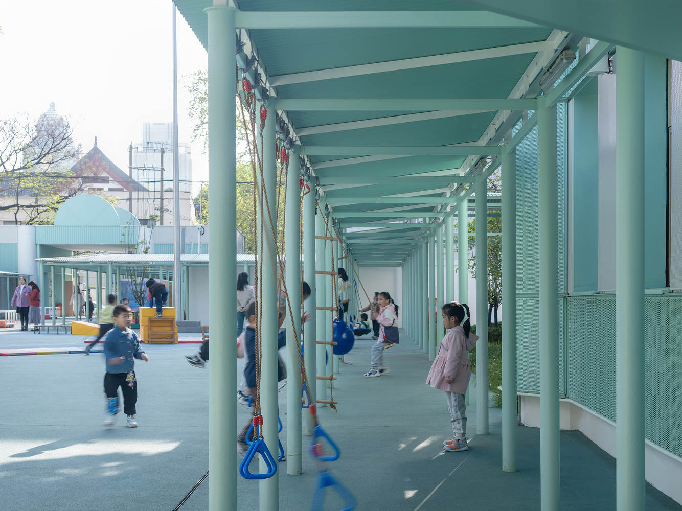 空间结构的巧妙重塑: 南京大学幼儿园的改造项目最引人注目的亮点在于其对园区空间结构的巧妙重塑。设计师引入了风雨连廊系统,巧妙地连接了原本分散的建筑和设施,化零为整。 这一设计不仅提供了遮风挡雨的功能,更重要的是,它对园区外部空间尺度进行了精细的调节,构建了更符合儿童尺度的空间层次。同时,连廊与建筑的融合也赋予了空间流动性和趣味性,如北廊分隔了人流和后勤流线,南廊围合出活动展亭,这些细节都体现了设计者对幼儿活动需求的深刻理解和对空间使用的精心考量。