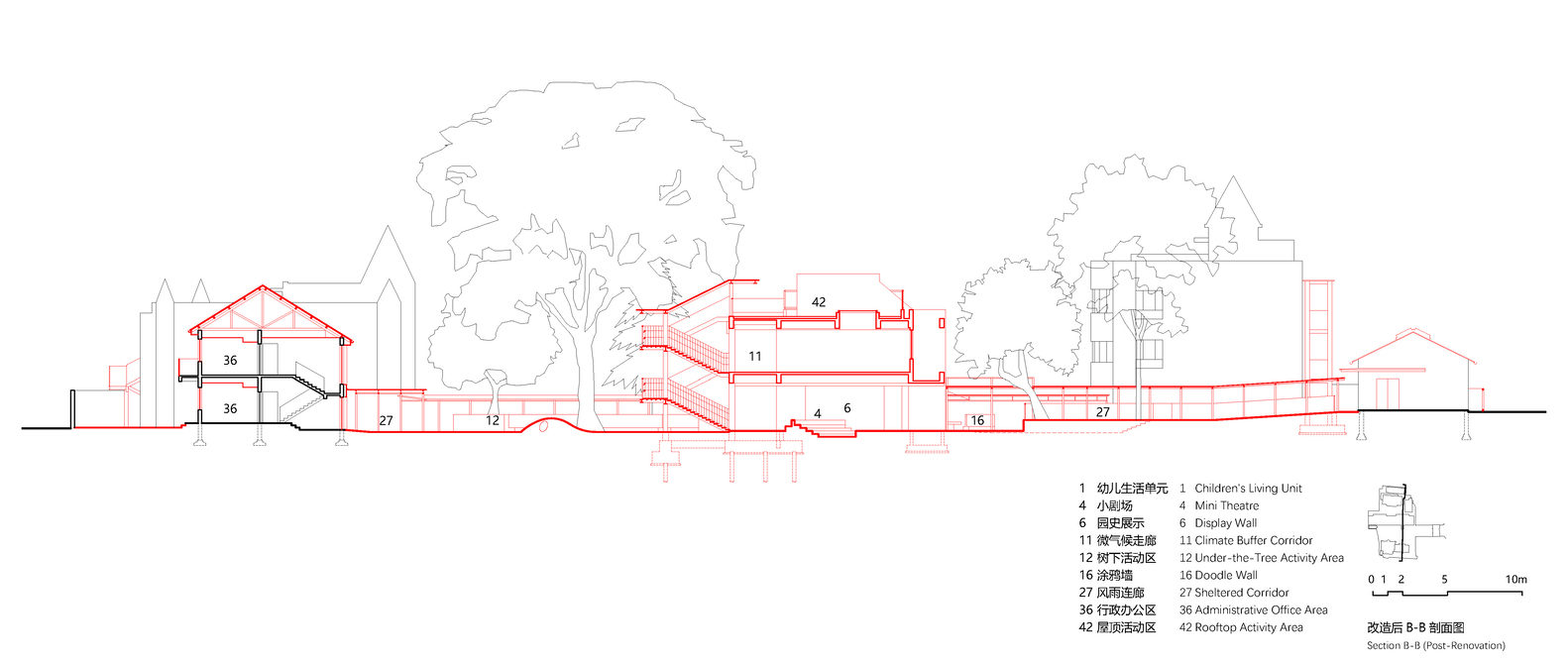 Among the buildings in the park, Building 2, built in the 1970s, has the largest scale and the highest intensity of use, and can be regarded as the main building of the park. However, its building quality is poor and the space is not suitable, which cannot match its importance.. Therefore, this renovation has the greatest impact on Building 2. The main body of Building 2 only retains some walls, and its structural system has been replaced from the original brick concrete structure to a reinforced concrete frame structure to meet the safety requirements of kindergarten structures.
