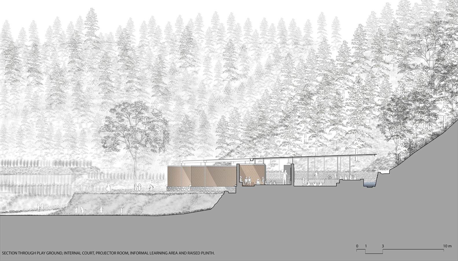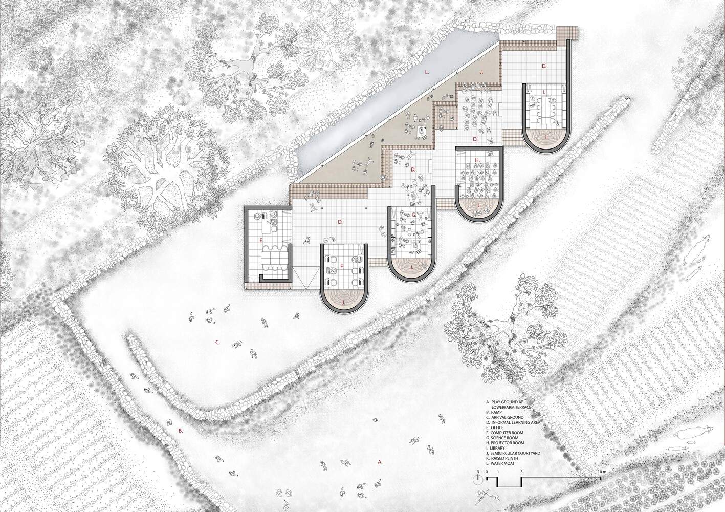 设计首先在场地外围设置一道水渠,用以抵御山体径流。办公室、计算机室、科学室、放映室和图书馆等模块化体块以对角线布置,既顺应盛行风向,又为未来向山体方向扩展提供可能。整体呈 U 形体量,采用符合空气动力学的剖面,以应对迎风环境。在水渠与体块之间,设计了一条锯齿状台基,既能排导雨水,又形成多个节点,被转化为适合学习与游戏的室内阶梯剧场。