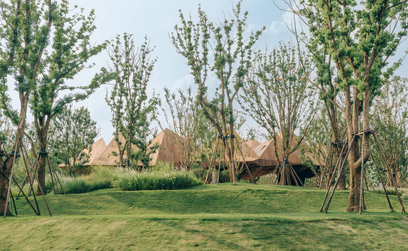 Climbing up a grassy slope, the building suddenly appeared completely in front of me. A huge solid wood mass floated on the ground, and triangular vertebrae held hands with each other, dancing and swaying. Children are often excited by the huge objects in front of them, running towards the overhanging roof that is over ten meters tall. The building is like a spaceship waiting to take off, and their emotions and bodies are once again brought to climax.