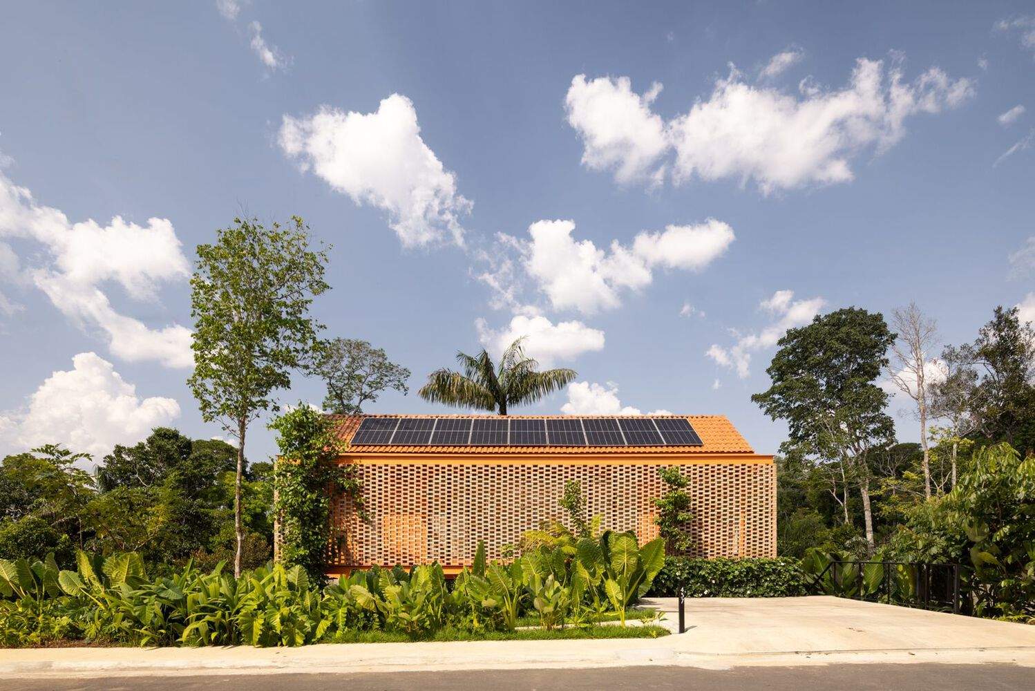 Priority should be given to selecting local suppliers and sustainable solutions for material selection. Ceramic tiles are produced near the construction site, and the coating adopts a color tone that echoes the Pupnia palm trees, creating visual harmony and enhancing the integration of architecture, landscape, and Amazon context.
