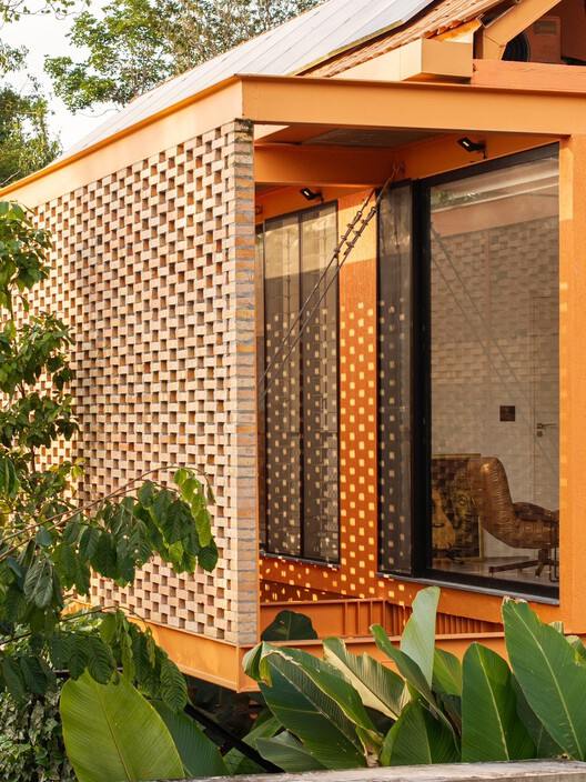 可持续策略与材料的选择:卡萨·普普尼亚住宅在可持续策略和材料选择方面也体现了卓越的设计理念。项目优先采用低环境影响技术,避免土方工程,通过双坡屋顶设计、自动化灌溉系统、雨水收集与再利用系统,以及优先选用本地供应商和可持续方案,体现了对环境保护的责任感。此外,陶瓷砖在工地附近生产,涂料颜色与普普尼亚棕榈树相呼应,营造视觉和谐,增强了建筑、景观与亚马逊语境的融合。这些细节都彰显了设计师对可持续设计和本土文化价值的深刻理解,使得住宅不仅是居住空间,更成为与自然和谐共生的典范。