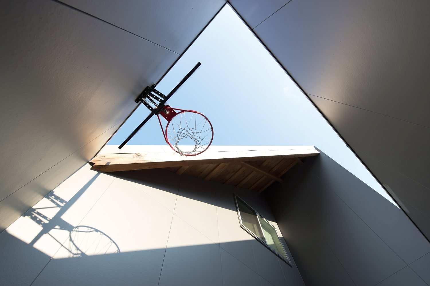 客厅上方设置中庭,如此一来,人们即便身处客厅,也能知晓楼上发生的情况。这种布局让父母与孩子既能保持恰到好处的距离,又能守护各自的隐私空间。中庭上方装设了天窗,让自然光得以洒落至一楼的客厅。