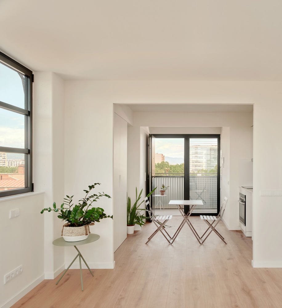 可持续设计与能源效率的完美结合: 该项目在可持续设计方面也表现出色,获得了A级能源认证。设计师通过被动式和主动式策略相结合,显著降低了能耗需求。生物气候设计优化了自然通风采光,确保了室内环境的舒适性。同时,项目配备了LED照明、空气源热泵及光伏系统,实现了近零非可再生能源消耗,体现了对环境保护的承诺。这种可持续设计理念不仅降低了建筑的运营成本,也为未来的建筑设计提供了宝贵的经验。项目充分利用可再生能源,体现了设计师对可持续发展的深刻理解和实践,为保障性住房树立了节能减排的典范。