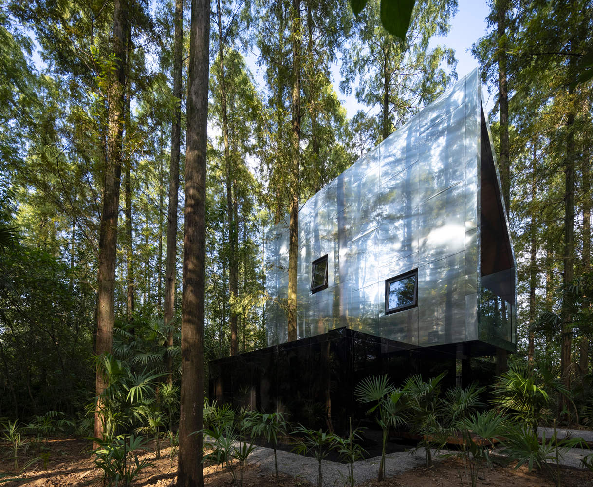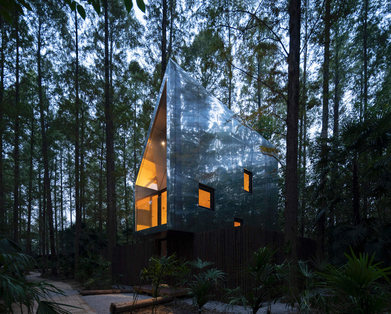 游乐园 Playground,源自儿时的幻想,被回家的大人遗忘该多好,遗忘在在游乐园,小小的就好,一个人荡秋千,爬上爬下,望着星星发呆,困了就睡大树下,和树上的小鸟说晚安,今晚,游乐场就是家。白日梦 Daydream 是一栋被镜面金属包裹的树屋,森林因此变得光怪陆离,在私享的森林里,阳光被反射,现实变的亦真亦幻,这个一栋鼓励做梦的树屋,和小鸟一起睡在天上。红磨坊 Red Windmill 是森林里的舞蹈家,纯粹的、彻彻底底的红色。红色的空间仿佛是森林里的剧场,水杉树和棕榈树是舞台上的舞者,随风而动。独角兽 The Unicorn 像森林里的神秘生物,披着银色的铠甲,阁楼是向上的角。