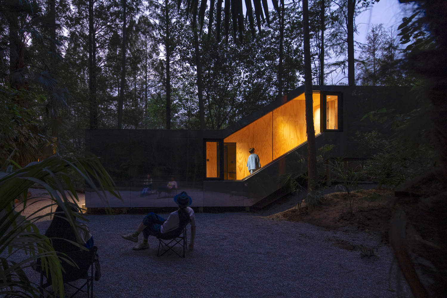 个个世界一直致力于通过自然地建造回归自然生活,“秘境 • Wiki Secrets” 延续了这样的自然野居试验,跳出面积大小的思维惯性,将注意力放在居住行为和环境的关系,空间的答案一定与日常的居住体验相距甚远,甚至有些偏执。“小”会让人离材质更近,因此我们变得更加敏感,既然已经来到了森林,不妨光脚待上一天,听一听枯树叶在露台上被踩碎的声音。