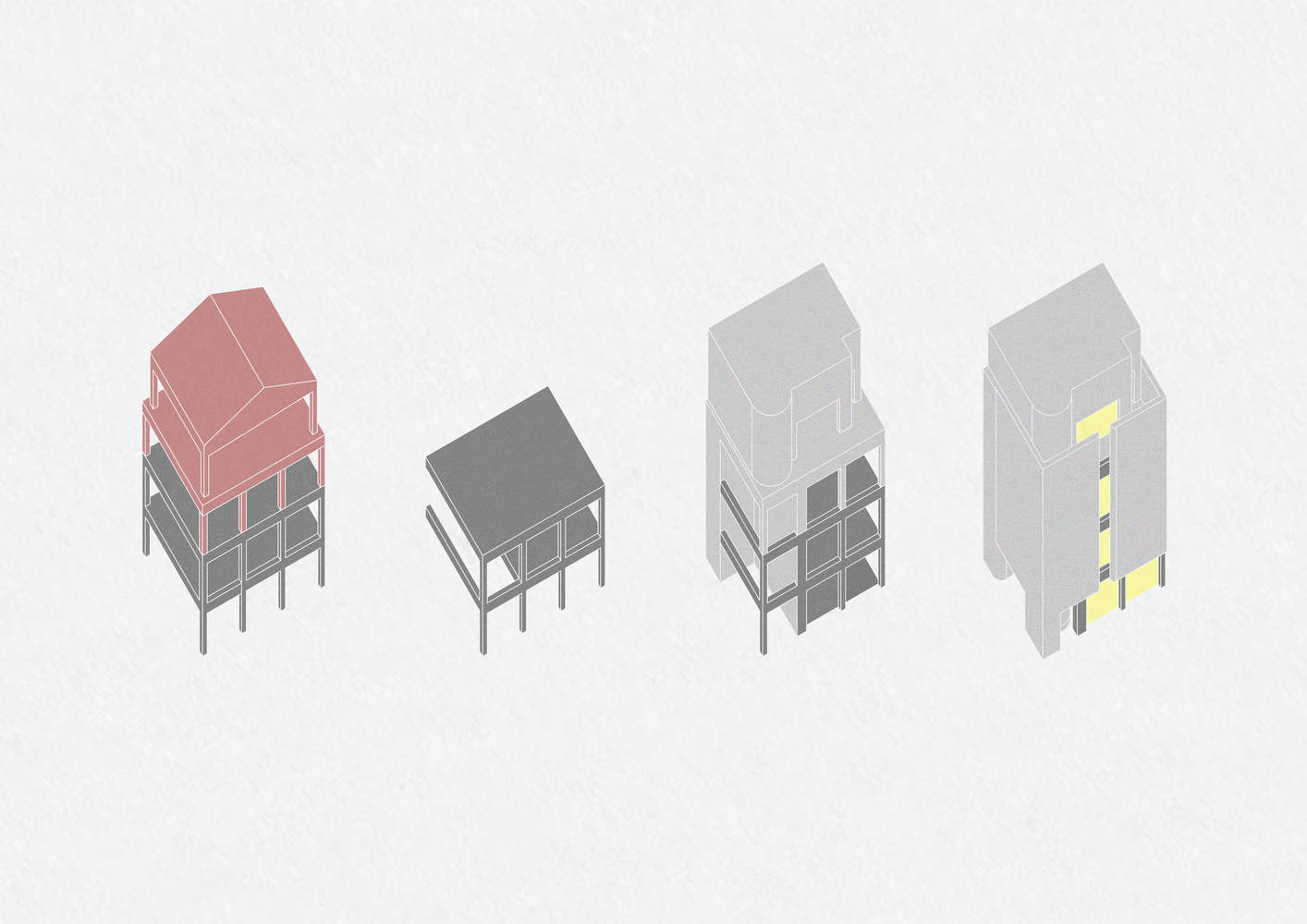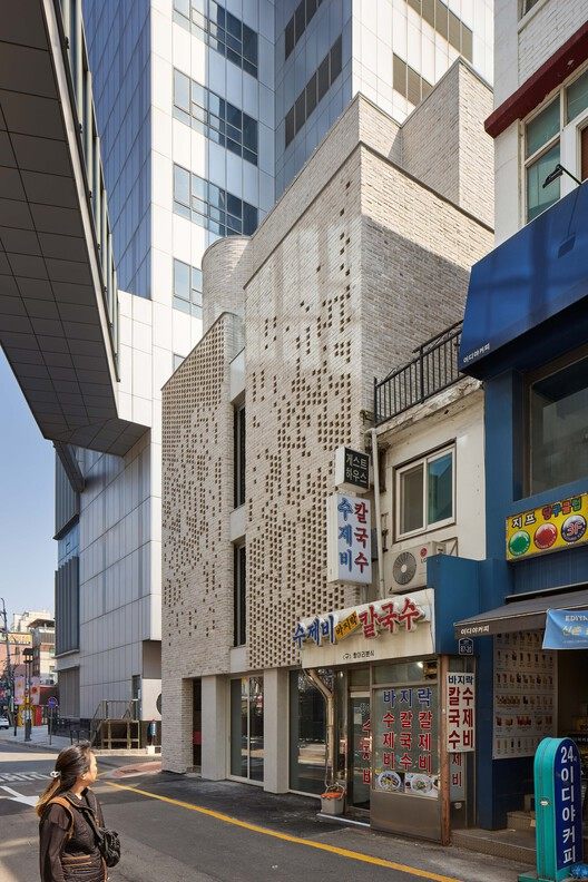这栋建筑于 1966 年竣工,位于首尔新村区,建造于城市化快速推进的时期。金汉龙(Kim Han-Yong)同年拍摄的航拍照片显示,汉江区域当时大多尚未开发,而城市在快速建设的推动下,正以前所未有的速度改变着城市面貌。该建筑过去五十年的历史不详,但如今其状况已严重恶化。其八根柱子中有四根超出了场地边界,而且这座如今四层的建筑最初只是一座建在独立地基上的两层小楼。后来,又加建了第三层砖砌结构和第四层轻型钢结构,使得整座建筑结构岌岌可危,如同积木塔(Jenga tower,一种层层堆叠木块的游戏,移除木块时若操作不当,整个塔就会倒塌)。