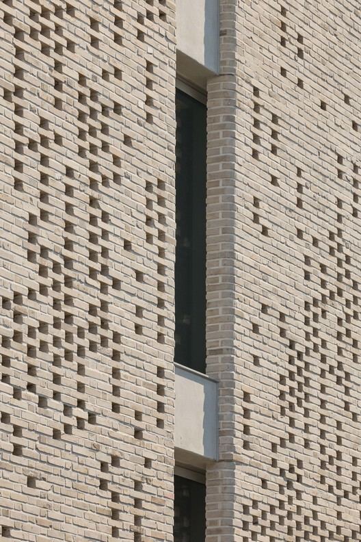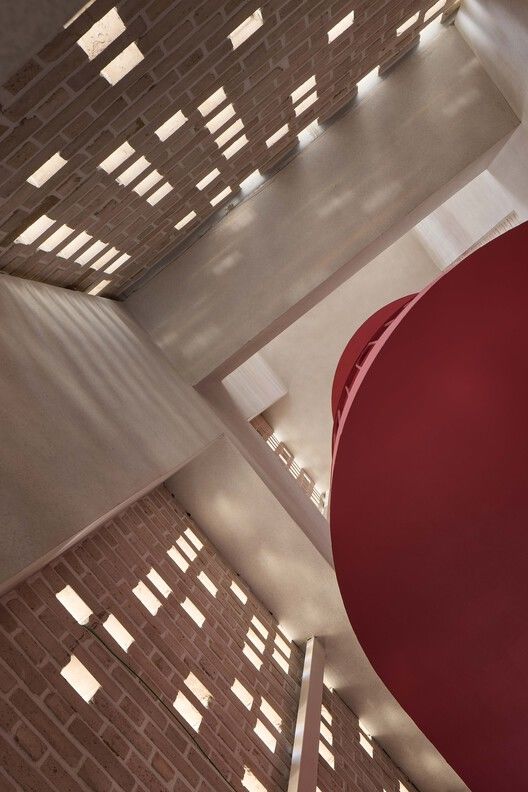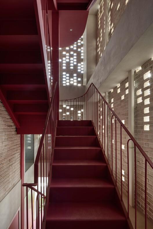 For the three and four floors designed for accommodation purposes, the challenge lies in balancing two conflicting needs: minimizing visual interference to adjacent buildings while ensuring sufficient sunlight. The solution is to use perforated brick facades, allowing natural light to penetrate during the day and allowing the building to shine outward at night, creating dynamic interaction between the inside and outside.