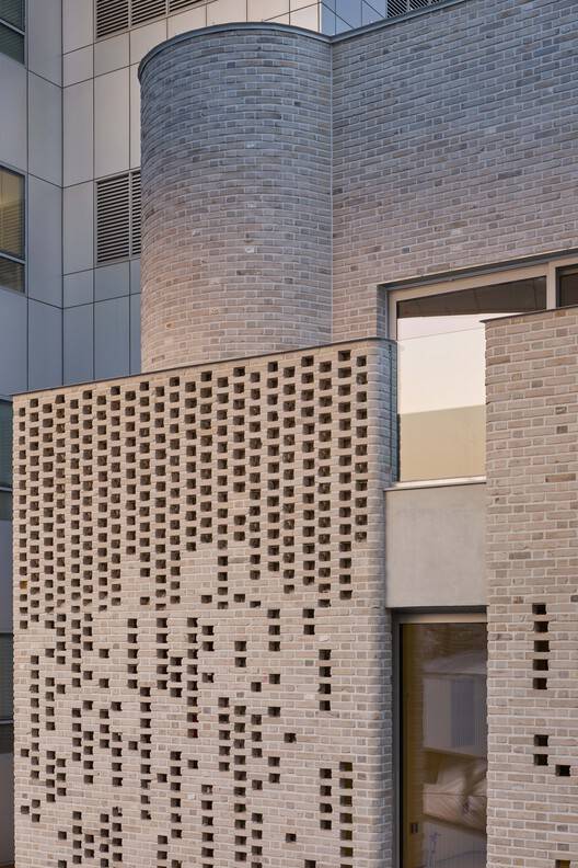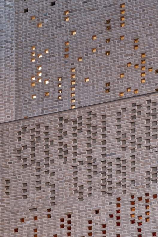 对于设计为住宿用途的三层和四层,挑战在于平衡两个相互冲突的需求:尽量减少对邻近建筑的视觉干扰,同时确保充足的日照。解决方案是采用穿孔砖立面,白天让自然光透入,夜晚则让建筑向外发光,创造出内外之间的动态互动。