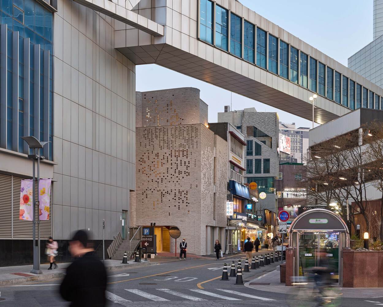从 20 世纪 70 年代到 90 年代,新村是文化交流的中心,大学生活、艺术家和社会运动在此交汇,孕育出新的思想和创意审美。然而,1991 年,摇滚咖啡馆被贴上“颓废文化”的标签并遭到打压,该区域的文化活力开始消退。到 21 世纪初,绅士化进程加速,大型连锁店和商业综合体纷纷入驻。小型独立店铺和文化场所逐渐消失,新村曾经独特的文化身份变得模糊。随着空置率上升,许多艺术家和创作者迁至弘大(Hongdae),而新村则转变为以连锁店和夜生活场所为主的区域。为此,当地商家开展了各种努力以重振该区域的文化精神,本项目便是这一广泛尝试的一部分。