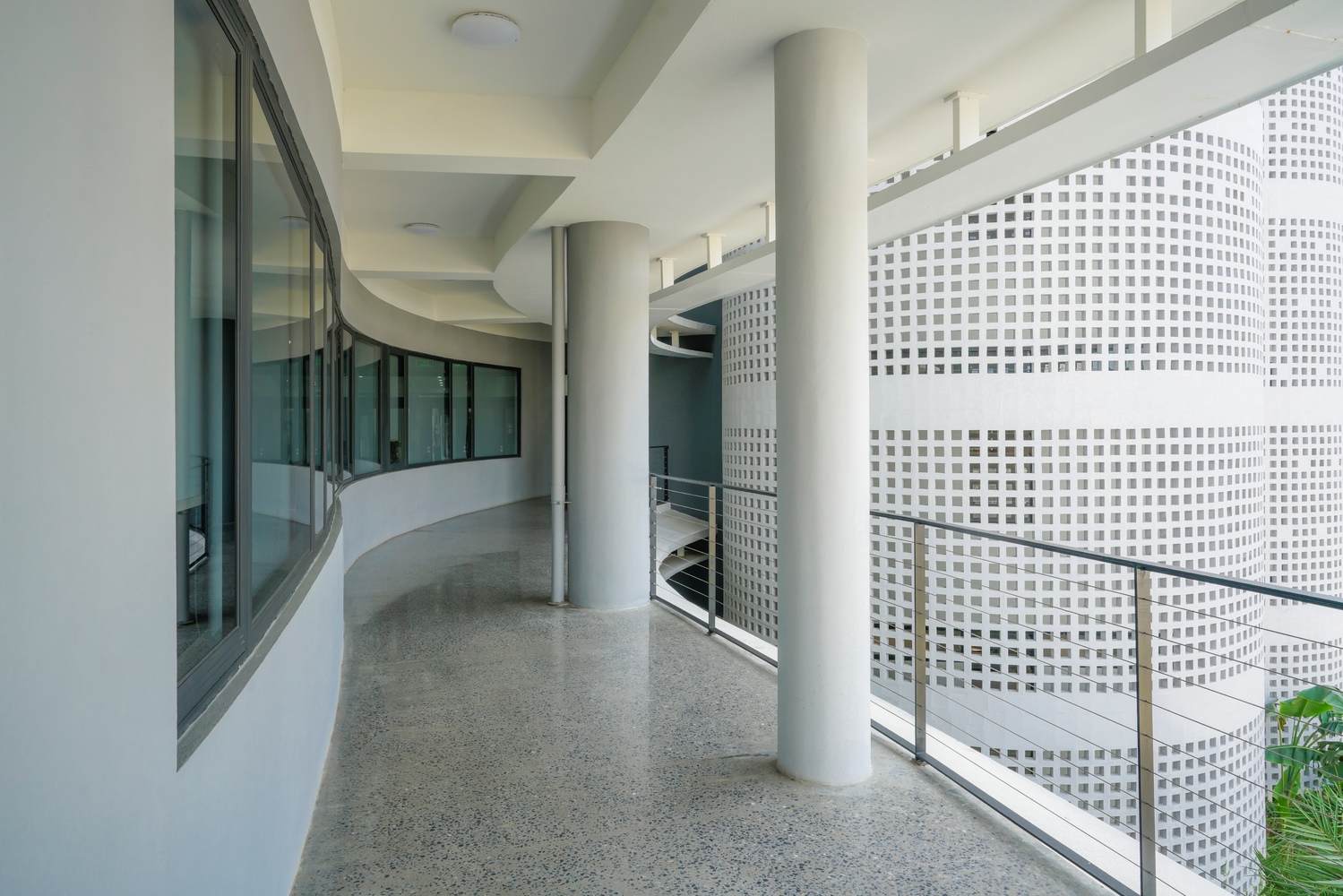 As the corridor extends along the contour line of the floor plan, this curved building with all glass curtain walls achieves a strong visual connection with the external natural environment. The core functional area of the building is set in the courtyard, giving this ordinary entity a new identity and elevating the exterior structure of the building to a tree like illusion.