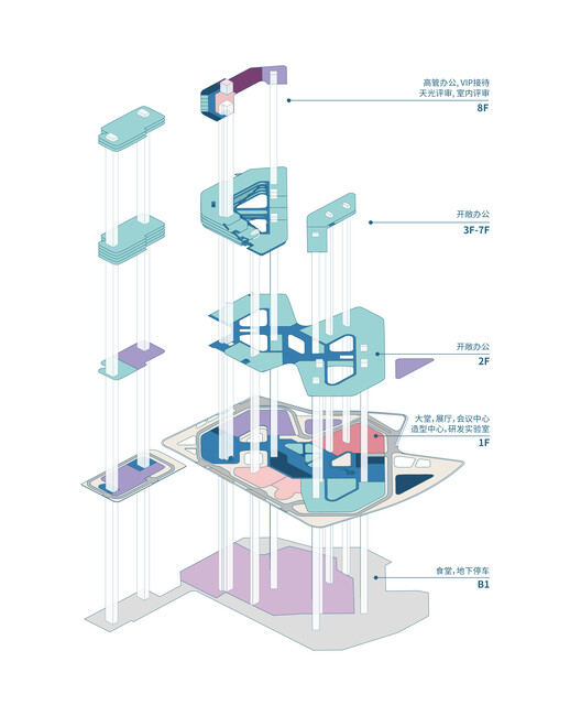 In addition to common functions such as office, research and development, reception, and display, the entire building complex also integrates core industrial functions such as automotive engineering research and development, automotive interior and exterior styling evaluation, and new car testing. The outer side of the main building is equipped with relatively independent Xiaopeng Motors flagship store, shared conference center, and flying car takeoff and landing site, making the overall building a large-scale technology complex with a complete industrial ecology. The green photovoltaic, sports field, outdoor aircraft takeoff and landing platform, and waterfront landscape on the roof are sufficient to become a rich open space integrated with the city.