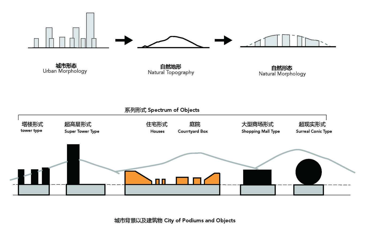 为消解地块自身的超高层垂直向的巨大压力,我们利用面积较大的居住 LOFT和办公 LOFT营造出两座人工山形体量,回应超高层塔楼的巨大尺度,并呼应周边的莲花山和笔架山。