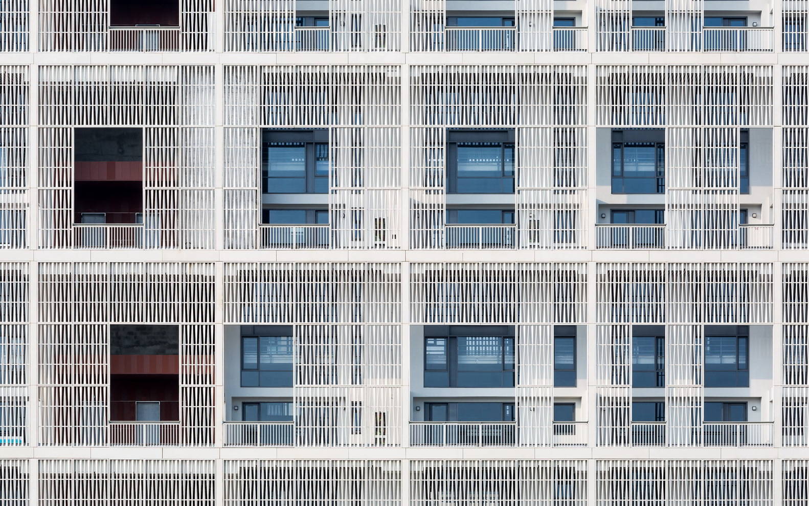 A区居住LOFT主体标准层高9米,可灵活划分使用;于南北两侧设置外廊,通风防晒良好;户户拥有私家庭院,邻里之间既有交流,又保证了私密空间。立面以灰白色“拧麻花”的格栅样式力求将材料本身的性能发挥到极致。