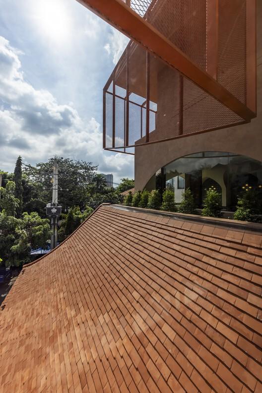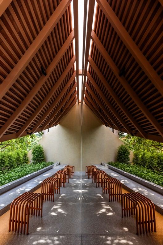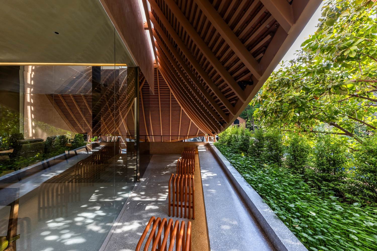最引人注目的特色当属那灵感源自越南传统建筑风格的宽大屋顶。屋顶线条优雅,呈弧形弯曲,并在街角处向外延展,不仅成为建筑的一大视觉焦点,还巧妙地衔接了室内外空间,吸引路人目光,促进与街景的互动。这一屋顶还延伸至二楼,形成一处通风透气的敞廊,为宾客带来灵活惬意、清新宜人的体验。这一设计远非对传统形式的简单象征性致敬,而是体现了创新精神与更深层次的文化探索。因此,设计中融入了遮阳敞廊、镜面水景和低矮座椅等元素,以唤起人们的怀旧之情,并向访客传递温暖亲切的欢迎之意。