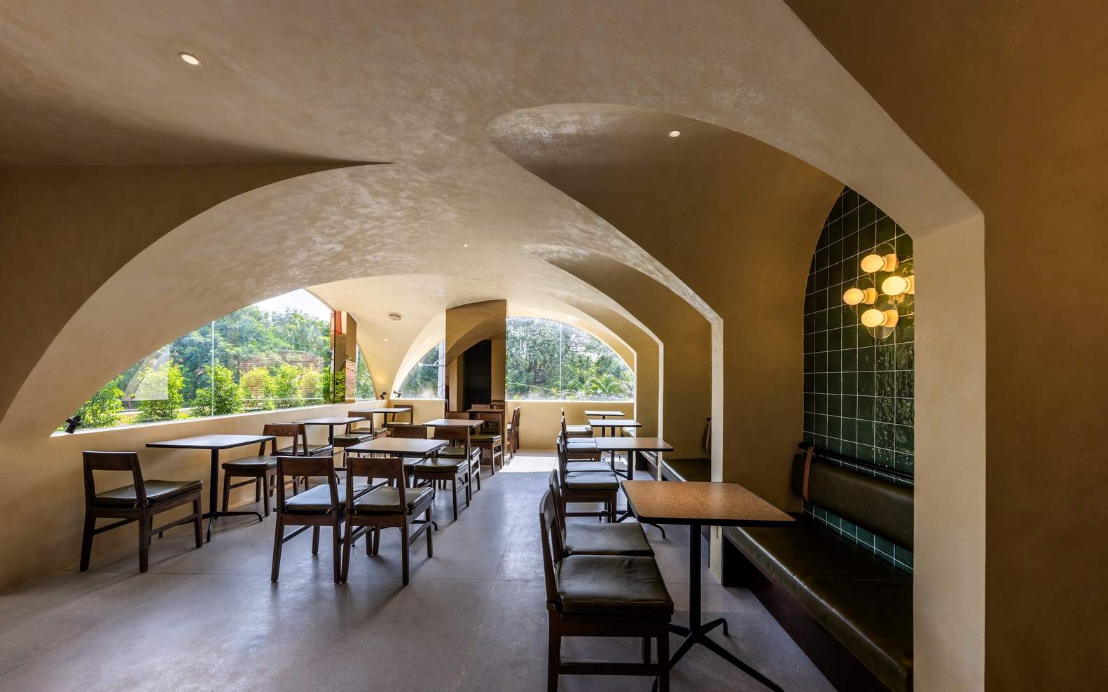 空间体验与功能性的完美结合: 咖啡馆在功能性和空间体验方面都展现了卓越的设计水平。通过保留原有建筑框架,并进行全面的升级改造,实现了对历史文脉的尊重和对现代生活需求的满足。建筑师精心设计的弧形屋顶,不仅是视觉焦点,也创造了通风良好的开放式走廊,为客人提供了舒适的体验。室内设计上,天然材料如木材、水磨石和手工瓷砖的运用,营造出温馨亲切的氛围。镜面和玻璃元素的巧妙运用,放大了空间感,并隐藏了结构柱,使室内空间更显开阔流畅,充分体现了设计团队对细节的极致追求,创造出引人入胜的视觉和感官体验。