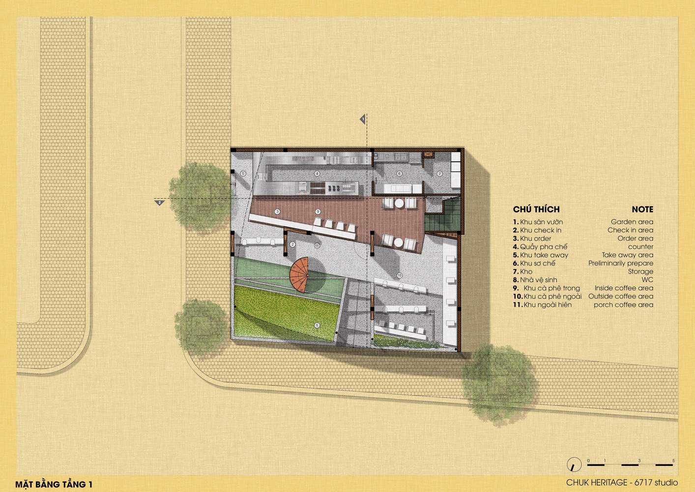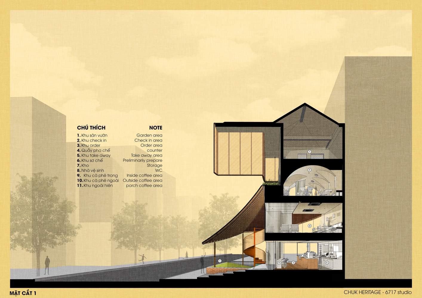 From the architect. CHUK Ruins Cafe is located at the intersection of 38th Street and Chunshui Street in Taodian District, Ho Chi Minh City, Vietnam. The area is renowned for its bustling cafes and dining establishments. CHUK Ruins Cafe is a unique cultural and culinary destination. This comprehensive space gathers two major brands, CHUK TEA&COFFEE and B Á NH M Ơ I, offering Vietnamese tea drinks, coffee, and baguette sandwiches. This project not only embodies the client's vision, but also tells the brand story - it is not just a coffee shop, but also a cultural exchange center that provides diverse experiences and connects people closely with nature. It embodies the concept of sustainable development and contributes to the inheritance of regional characteristics in the current rapid urbanization process.