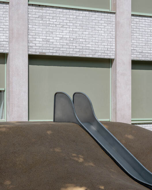 景观重塑与生态教育的深度融合:该项目的另一大亮点在于对校园景观的重新规划,将传统的硬质操场改造为生态、多功能、且具有教育意义的绿色空间。通过雨水花园、本土植物的引入,以及对生物多样性的关注,将校园打造成一个自然的教育场所。设计师巧妙地将游乐设施与自然环境相结合,创造了运动场、游戏土丘等结构化区域,以及岩石、树干、荫蔽花园等自由探索空间,为学生提供了多样化的活动体验。这种设计理念,不仅丰富了学生的课余生活,更让他们在玩乐中学习,在实践中探索,从而培养他们对环境的认知与热爱。