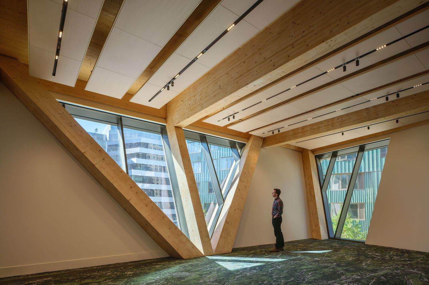 这座建筑外露的重型木结构塑造了其独特的建筑风貌,也强化了其作为创新目的地的定位。建筑外立面上,倾斜的木结构立柱如树枝般向外延展,支撑起悬挑的上层楼板。建筑每个立面均经过精心设计,以呼应室外环境及周边社区。建筑南北立面向外展开,引导人流汇聚至多个入口;而东西立面则向内收拢,拓宽了行人通行空间。