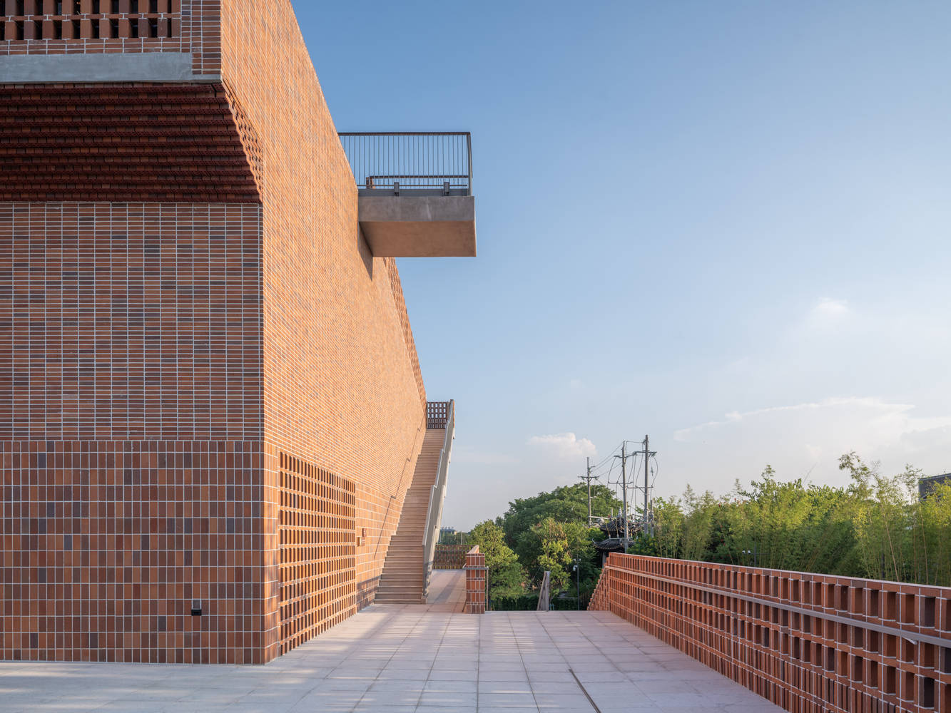 得益于现代工艺,耕学+采用的窑变红陶砖,每块砖因烧制过程中的温差而产生了深浅不一的颜色变化,有效规避了工业制砖的均质化问题,为建筑注入了活力。基于功能需要,不同立面采用的砌筑工艺也不尽相同,从而使立面更加丰富且具有趣味性。所有陶砖均为空心砖,内部穿钢管,采用干挂式做法安装。