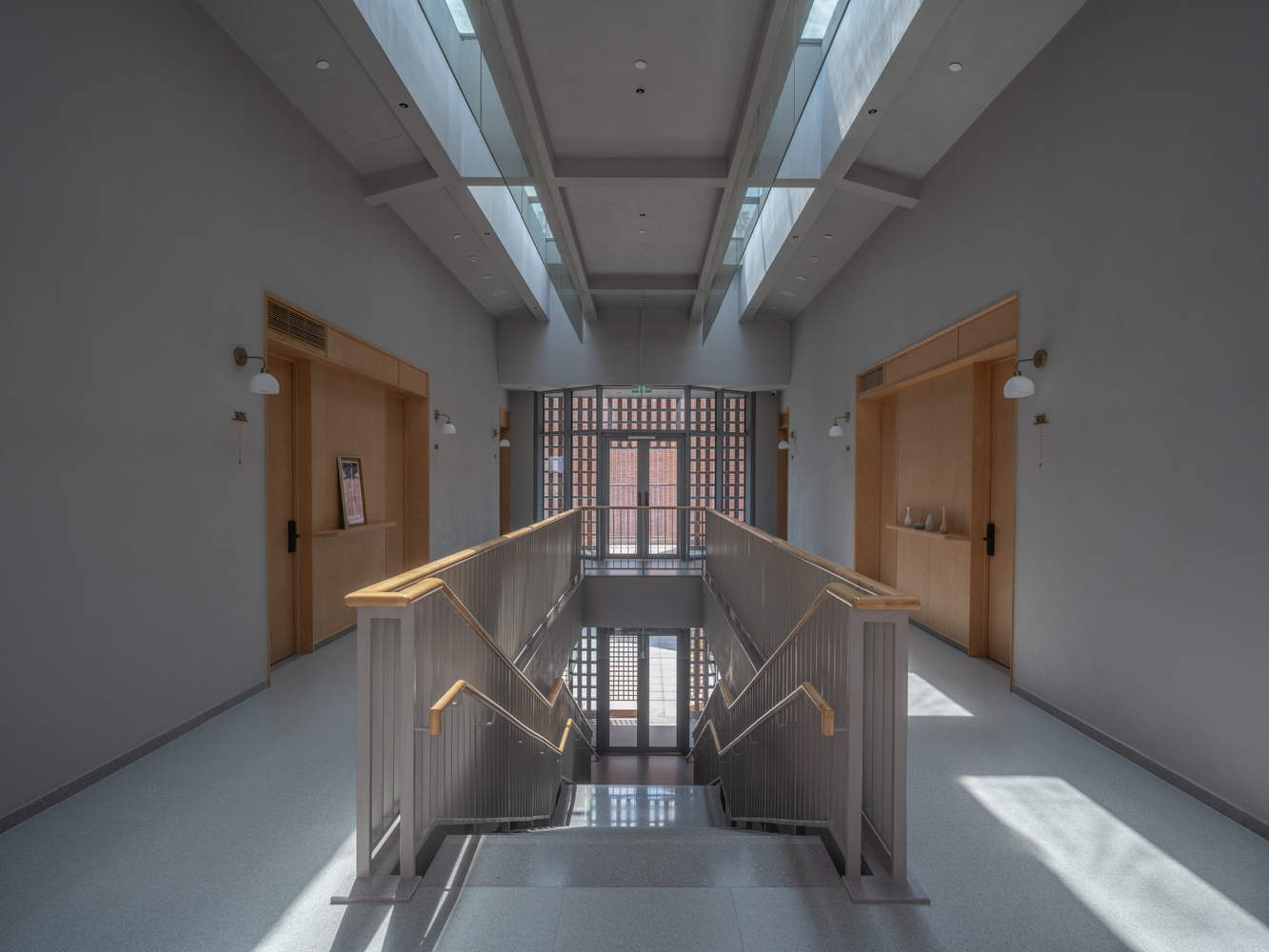 The indoor space form is in line with the functional requirements of each floor. 2、 The three story dormitory is arranged around the courtyard, connected to the public space on the first floor through a large staircase, creating an open and flowing spatial sense. The design prototype is derived from the internal spatial pattern of traditional residential buildings in Changtou Village. To facilitate the passage between the three buildings, the various areas on the first floor are connected by open corridors to ensure that teachers and students can freely access them.