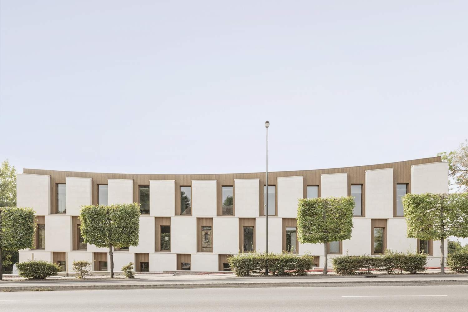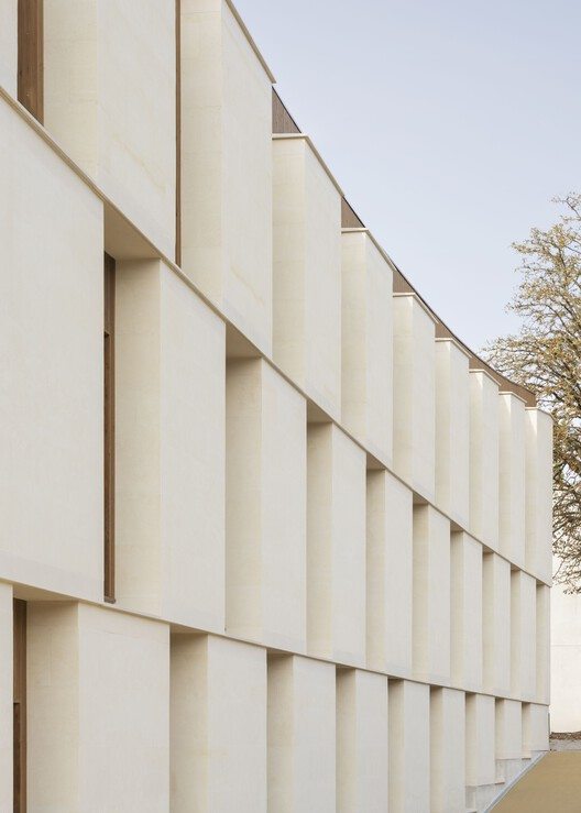 Its shape is simple and lively, conforming to the site's form: it is a rectangular prism that unfolds in a fan-shaped manner, and the roof has a concave curve shape. Its smooth lines are like hyphens, connecting towns, parks, and other university buildings together. The large blocks of stone used for the building facade are sourced from local quarries, echoing the commemorative buildings made of similar materials in the area, further strengthening the close connection between the building and the land.