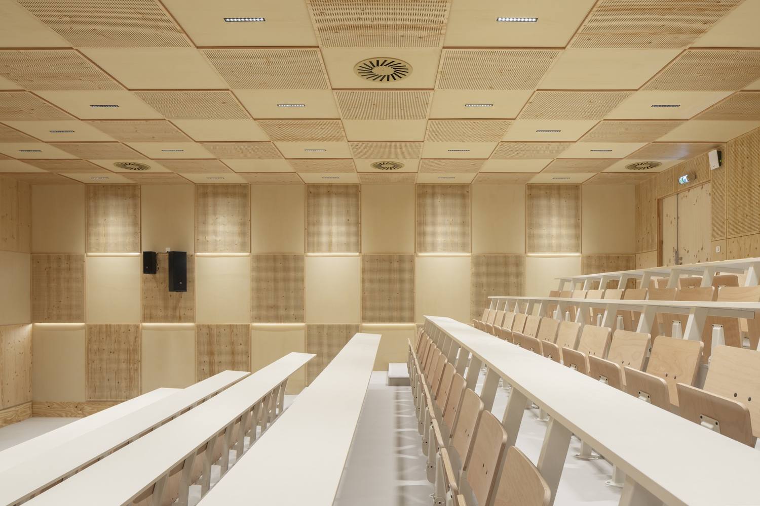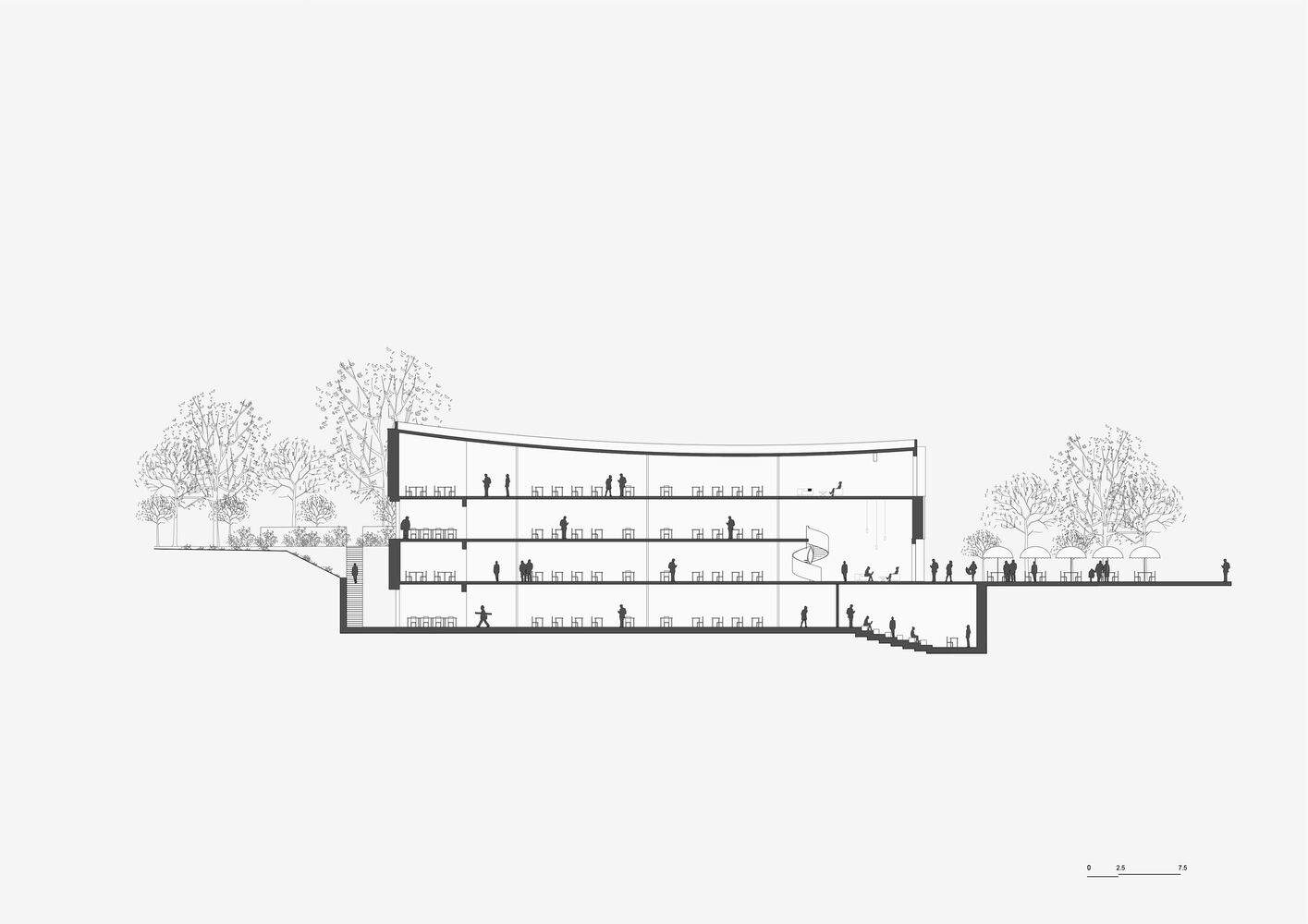 行政办公室设于建筑最狭窄处,此处深度恰好适合此类用途。最后,地下层设有一间讲堂和若干计算机房,这些空间得益于地下窗井内繁茂植被间透入的自然光线。