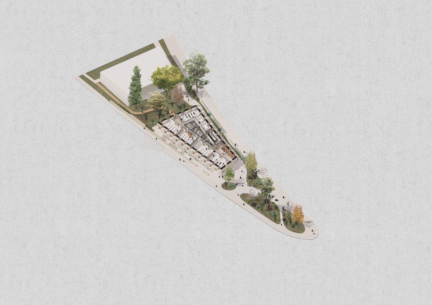 The design school is located on the easternmost side of the site, thanks to the layout of a spacious public vestibule that marks the main entrance and ensures a smooth transition between the campus and the street. The design school enjoys high visibility in urban spaces.