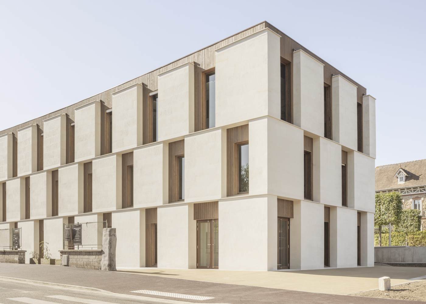 所有外立面均以同等程度的关注与优雅风格进行处理。它们呈现出如棋盘般规整的节奏,石材与木质框架窗洞交替排列。这种模块化逻辑与堆叠石材的运用,造就了简洁、高效且紧凑的建筑风格。外立面材质简约,依托于规整的网格布局,通过深浅变化以及透明与不透明材质的交替,为建筑立面增添了灵动之感。