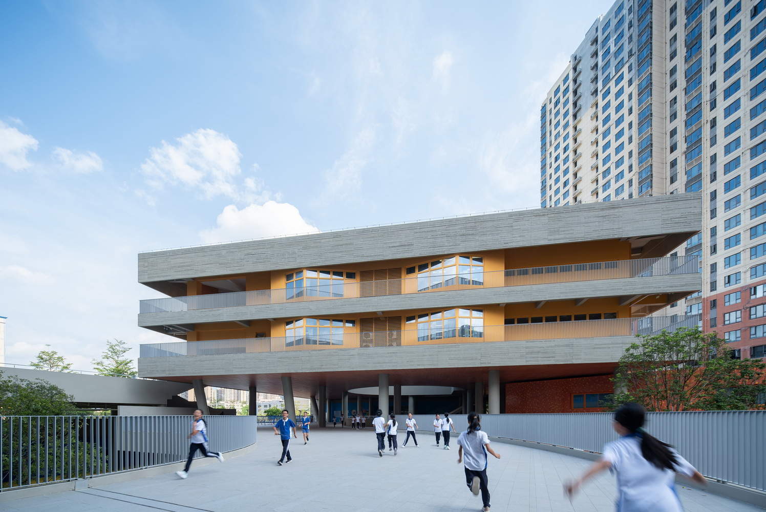 At present, it is urgent to repair the fragmented urban blocks left by years of crazy real estate development, and weave them back into complete and livable living spaces. In Longgang District, a high-rise residential area surrounded by urban villages, industrial parks, and city main roads, we have filled in two primary and secondary schools to complete the construction of the entire block. The strong geometric order of Hakka walled houses has become an anchor point to resist homogeneous development in the surrounding areas. The open campus boundaries and interconnected settlements are not only public spaces for children to discover their potential, but also provide space conditions to break through the closed walls of the campus and explore community co operation, allowing the academy to nourish the community and grow together with it.