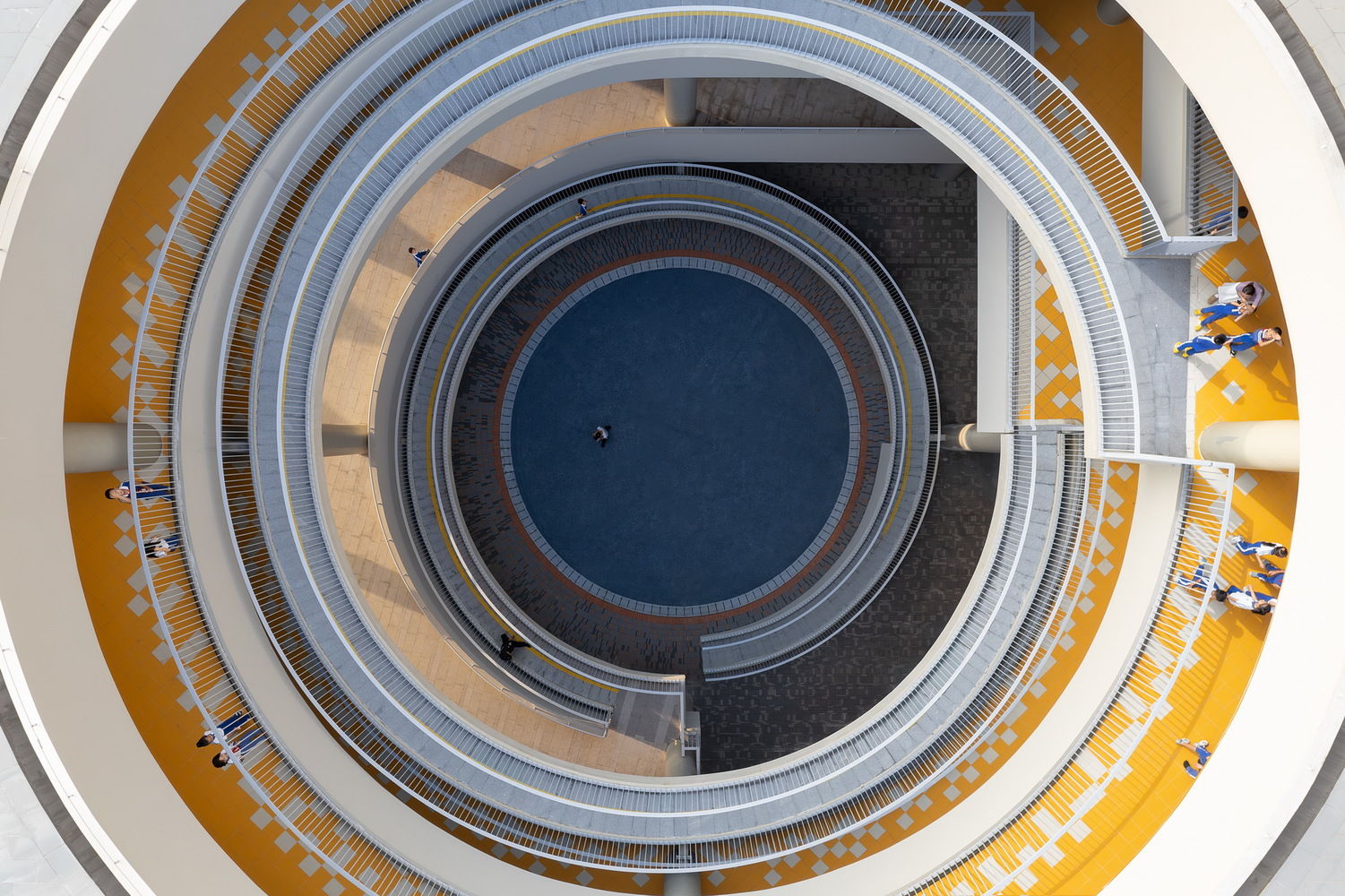 低年级书院以圆形的坡道环路与趣味性空间激发探索欲望;中年级书院通过开阔的拼色运动庭院鼓励活泼自由的奔跑; 高年级书院则是通过静谧的庭院与植被,营造专注与交流并重的学习氛围。