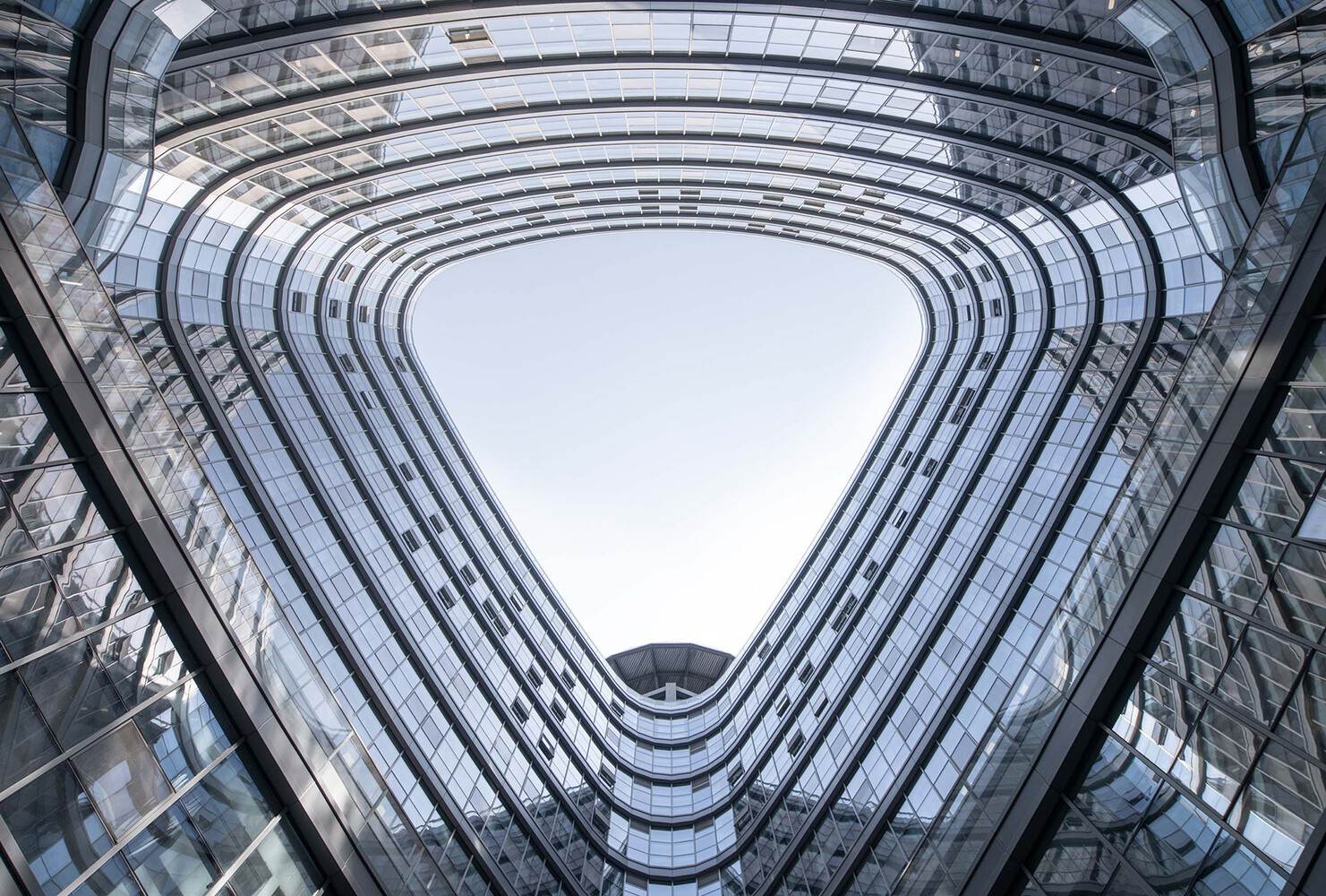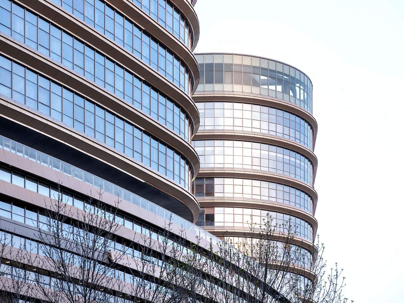 该项目用地形状近似一个有缺口的三角形,南侧紧邻山东大学趵突泉校区,北侧靠近趵突泉公园和泉城广场,是济南市重要的历史文化空间节点。建设用地面积约为23,800 ㎡,南、北两侧用地的高差约为6 m,建筑限高60 m。另外,项目处于趵突泉泉域汇集区,地下开挖深度受限。在高容积率、低限高、低限深的情况下,本项目通过层层逻辑推导,因地制宜,采用流线型三角形双塔楼布局策略,在双塔之间形成视线通廊,巧妙地避免其对老住院楼造成视线干扰。流线型裙房造型灵动流畅、简洁而富有变化,具有强烈的水平延展性,形成独特的城市街角形象。首层局部架空,营造出亲和、自然的空间序列,使区域内的街区关系更加自然和谐,有效缓解近人尺度的压迫感。项目实现了医疗功能与城市关系的平衡。