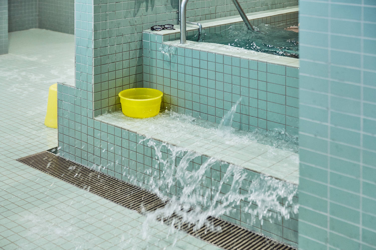 与黄金汤一样,狛江汤最初也是一座建筑型公共浴室,是钢筋混凝土建筑的一部分,上层是居住空间。但是,由于场地位于狛江市郊,附近有许多空地,我们决定利用这些空地建造一个公共浴室。我们想象了空地如何与随着时间推移而变成绿地的暗渠交织在一起,并决定将这些绿地与舒适的桑拿房和酒吧结合在一起,打造一个公共浴室。我们定制了多治见市的原创绿色瓷砖,以营造与绿地的亲和氛围。