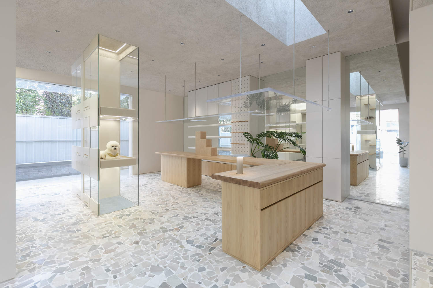 Despite occupying a small area, the team carefully planned separate paths for dogs and cats to reduce conflicts between the two different species.. The store provides separate areas for cats and dogs, including separate entrances, reception areas, and care desks. The two ends of the cantilever table are reception desks for different types of pets, and the integrated L-shaped design not only avoids pet friction but also ensures convenient passage for staff behind the table.