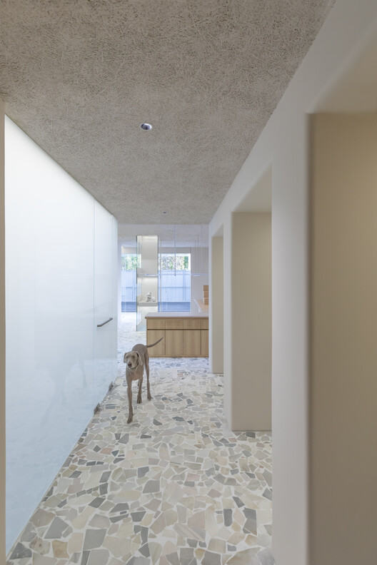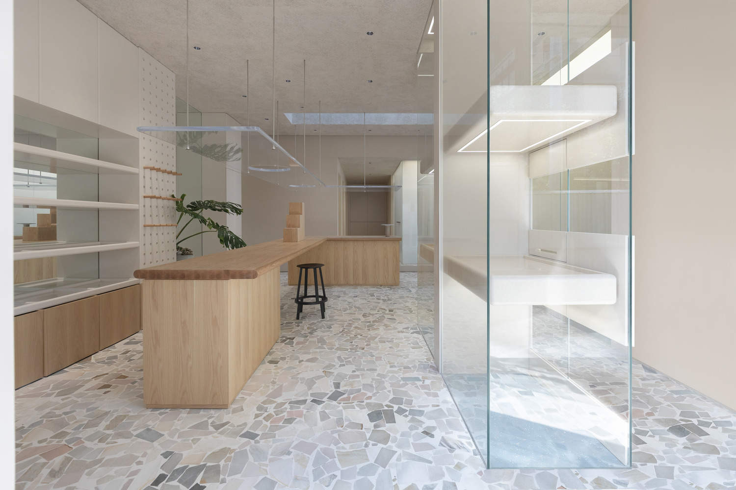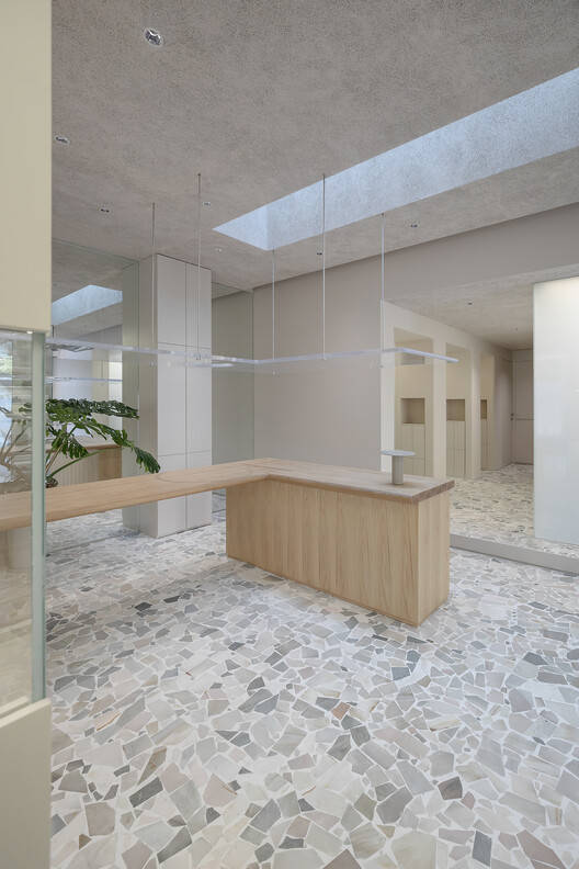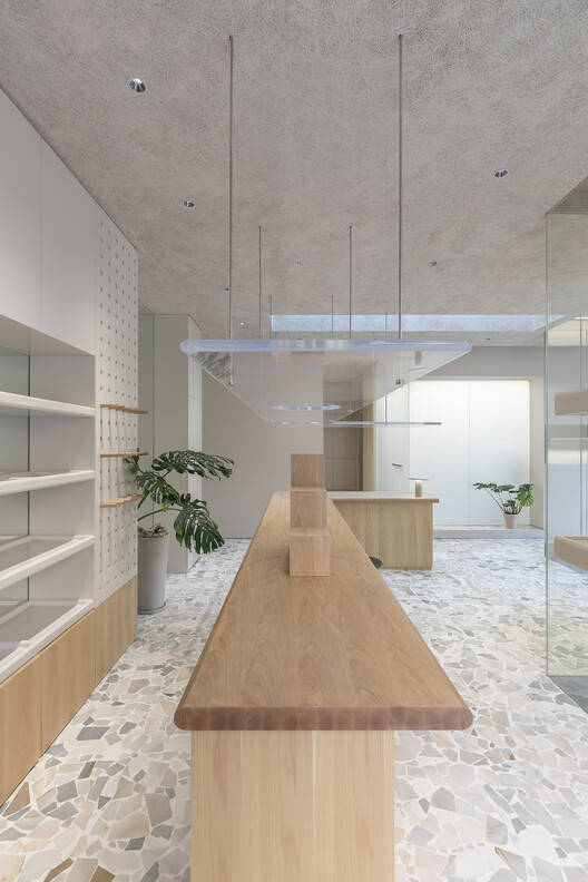 整体的空间力求与自然建立更多的联系,尽可能地为动物们营造天然的氛围。碎木铺设的天花,在吸收声音的同时也为空间融入了自然的肌理感。利用单层的建筑所开设的天窗更增进自然采光。土黄色的不规则石板铺砌着地面,将户外气息进一步引入室内。由于猫和狗仅有双色视觉,空间里选用的柔和色调能帮助他们区分Paw和城市场景,让宠物入店时能感受到他们进入了一个独特舒适的环境。店内的主要功能空间采用蓝色水磨石地板,而米色的可丽耐板则用于展示区、寄养区和护养区,以便维护。木制桌子和柜台则为公共区域增添了和缓的氛围。